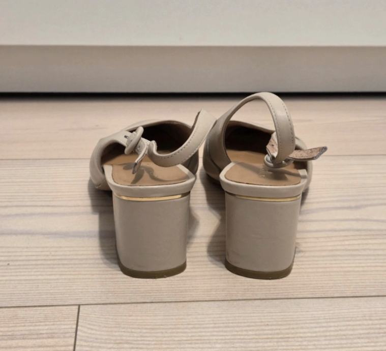 Prodajem ženske cipele tipa slingback u bež boji, veličina 41 (odgovara i 40, ovisno o modelu). Radi se o modelu s šiljastim prednjim dijelom i otvorenom petom s remenom koji se kopča. Peta je blok oblika, visine 3 cm, s diskretnim zlatnim detaljem, što ih čini ugodnima za nošenje kroz cijeli dan. Materijal je glatka koža bež nijanse.