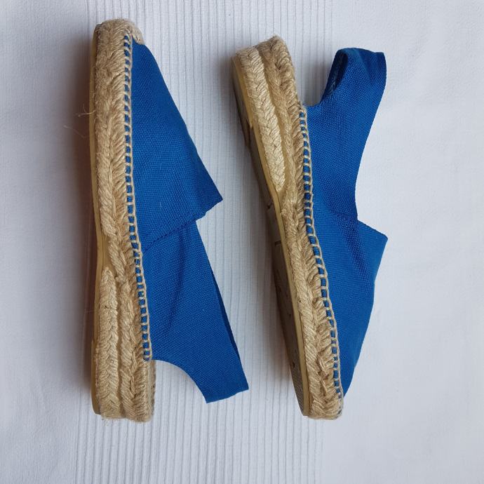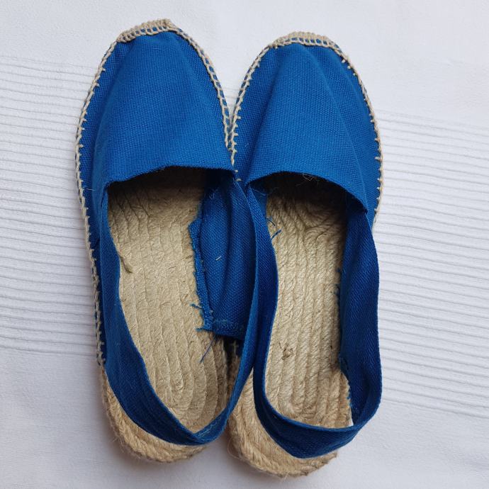 Potpuno nove, nikad nošene ženske plave espadrile kupljene za vrijeme boravka u Španjolskoj. Ručni rad, veličina 39 ali je kalup manji pa je veličina prije za nogu 38. Zatvoreni prsti, otvorena peta, peta visine 35 mm.
