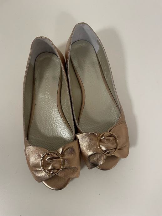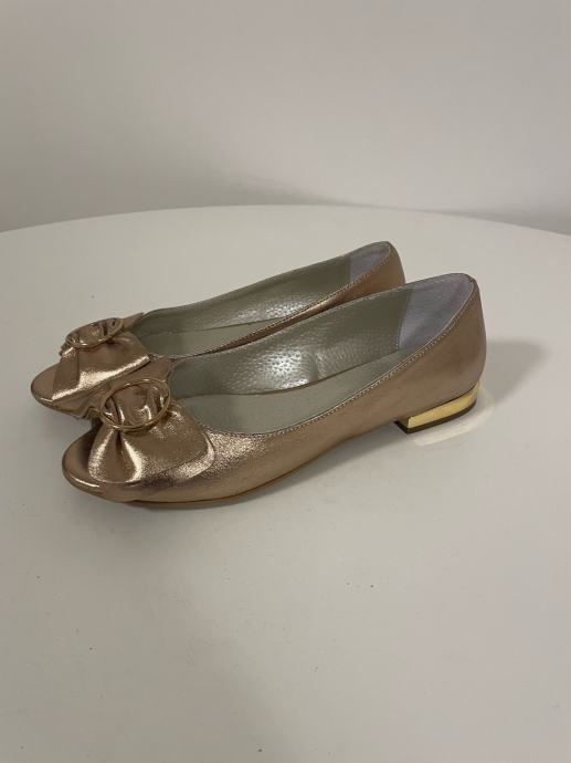 Elegantne zlatne balerinke veličine 38, potpuno nove bez etikete. Ukrašene su lijepom mašnicom s metalnim detaljem koja daje poseban šarm ovoj obući. Savršene su za svakodnevne kombinacije i svečanije prilike.