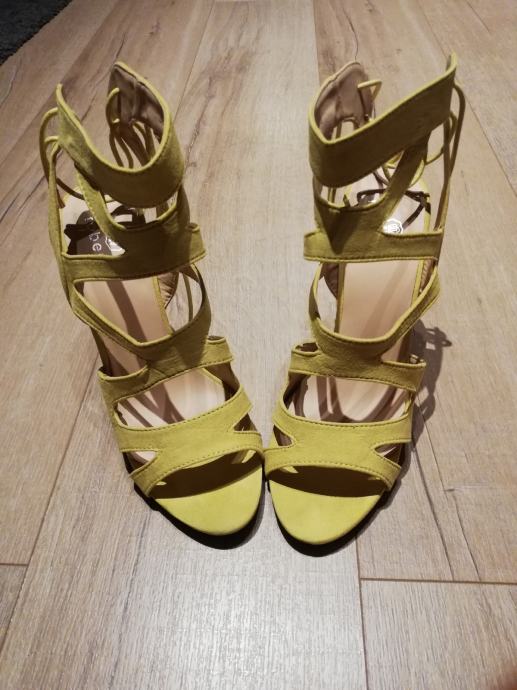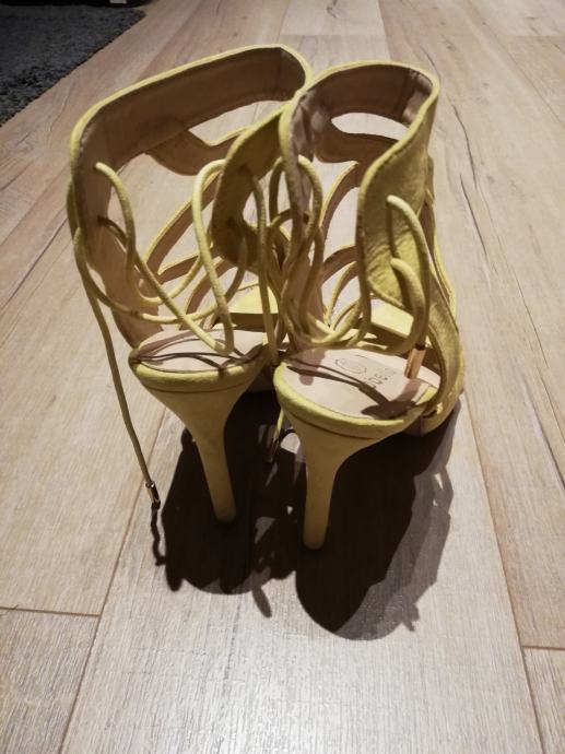 Efektne žute sandale na visoku petu. Veličina je 40. Iza se vežu pa se može malo prilagoditi veličina. Nošene samo jednom. Uz njih dolaze i zamjenski nastavci za pete. U Zagrebu i Karlovcu moguća je primopredaja. Pogledajte i ostale moje oglase, na više kupljenih stvari popust.