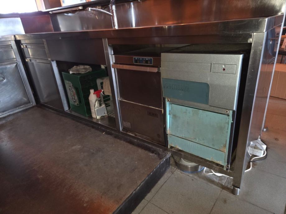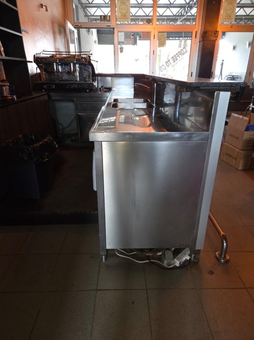 Prodajem šank, neutralni, super očuvan, bez oštećenja, proizvela ga tvornica Končar, od čvrstog, debelog inoxa. Ide u L, desni dio dužina 300 cm, dubok 70 cm, visina 90 cm. Lijevi dio dužina 100 cm, dubok 70 cm, visina 90 cm.