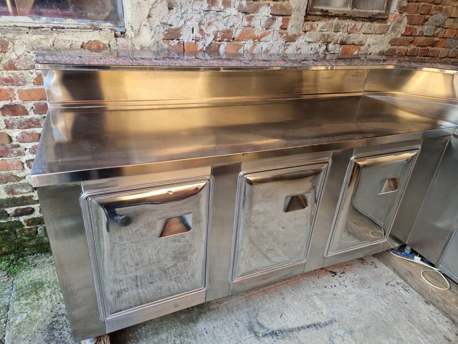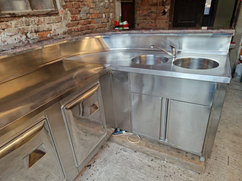 Prednja strana drvo, gore granitna ploča, stražnji dio profesionalni inox s radnom površinom, sudoperom i ormarićima.