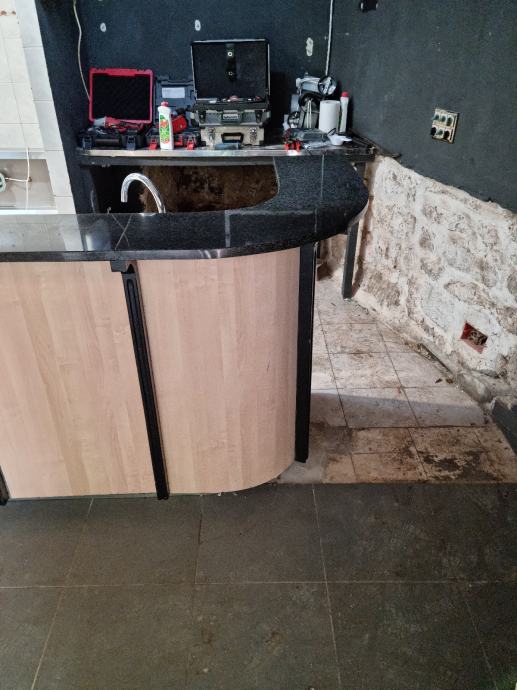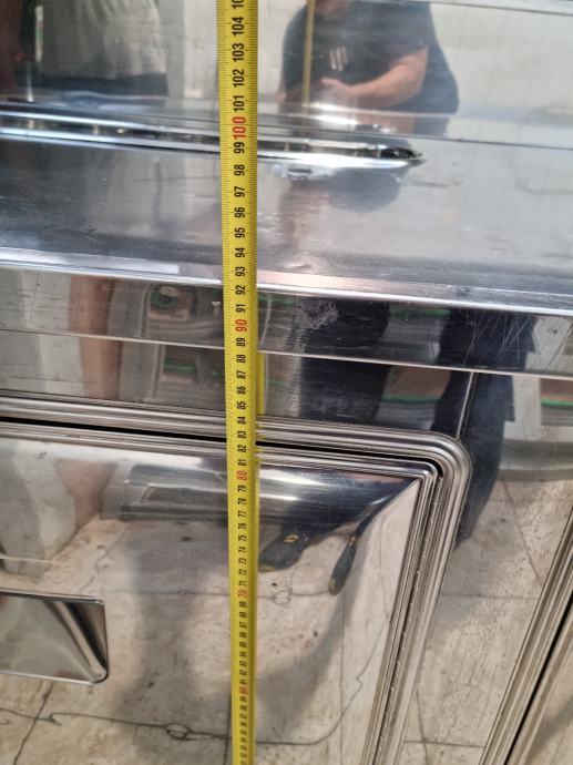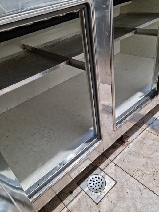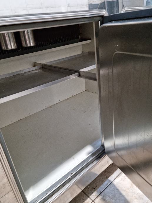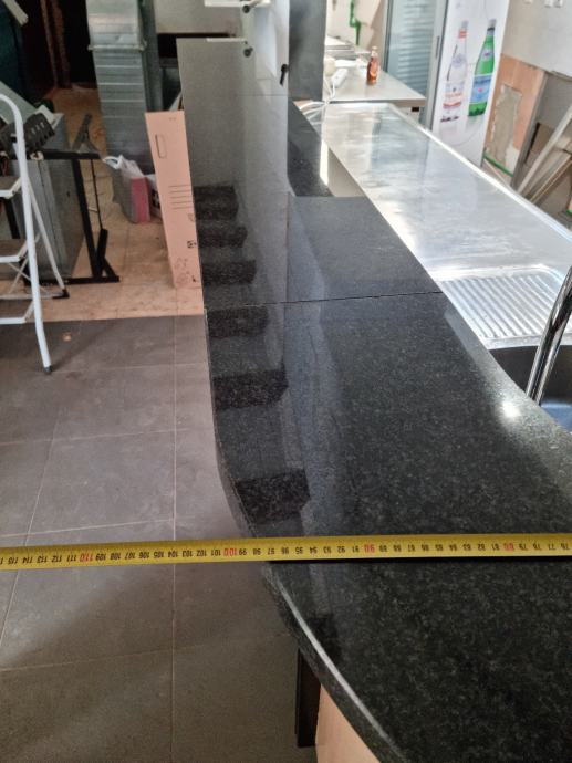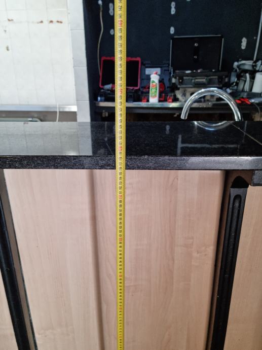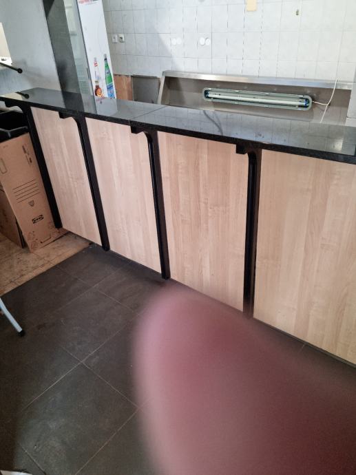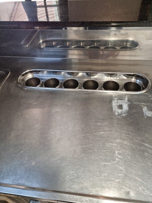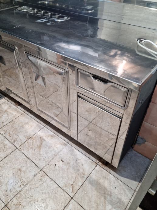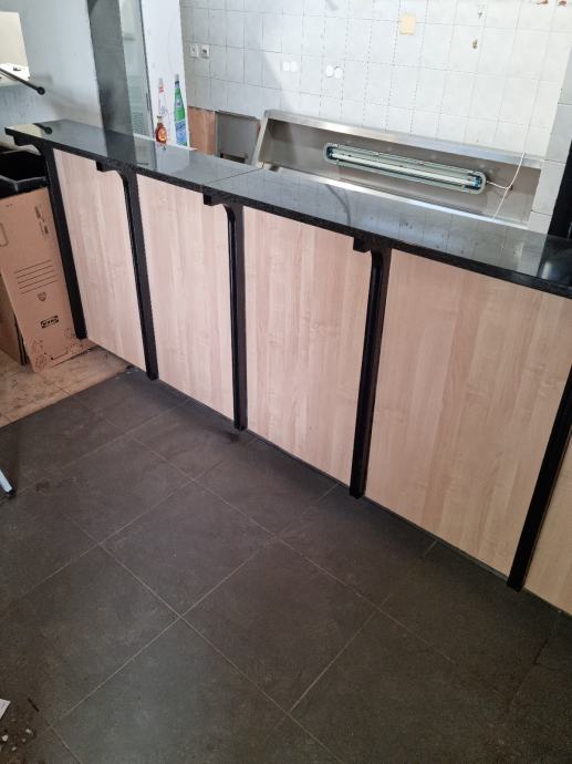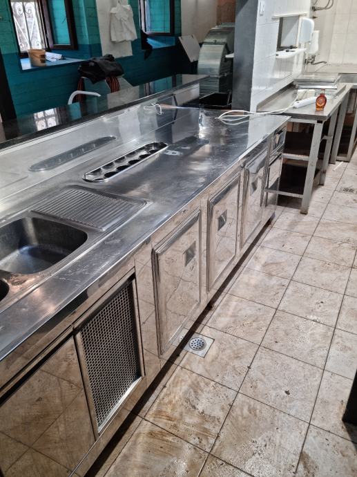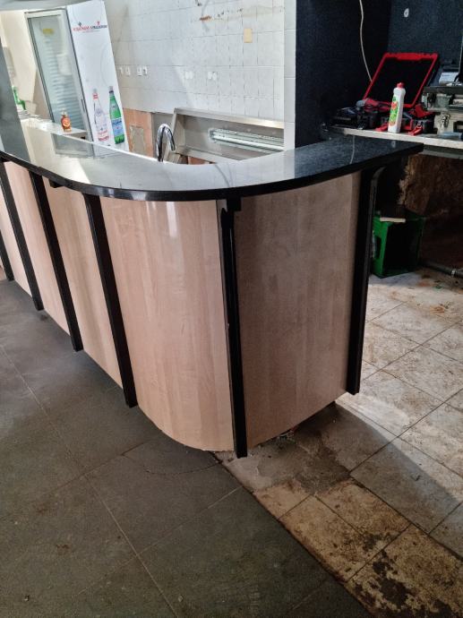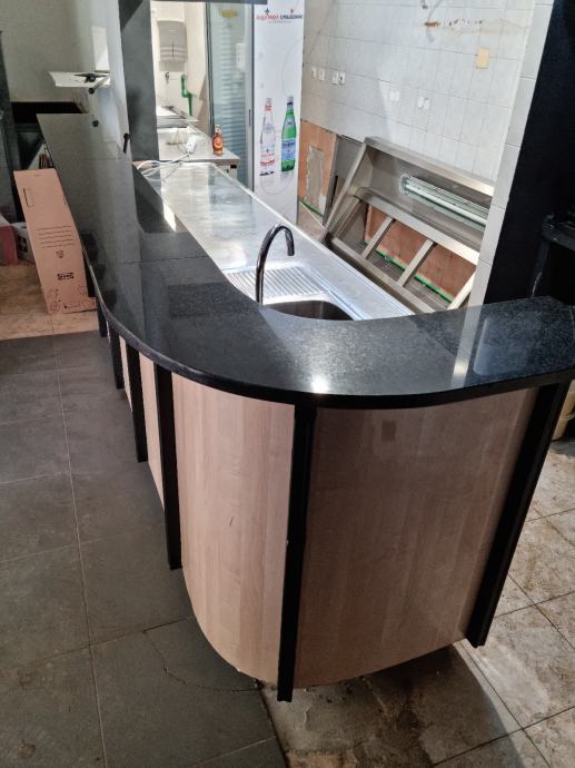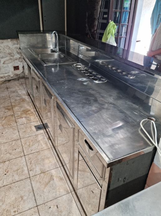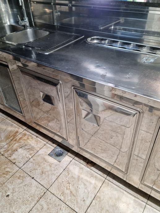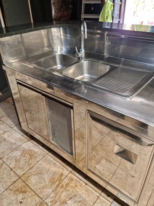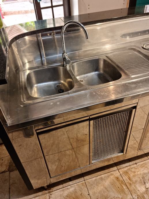 Crna granitna ploča,sudoper 2 korita,protočni bojler za toplu vodu,mješalice za vodu, vanjski hlađeni dio za 5 boca,rashladni boksevi 3 vrata sa policom,mjesto za spajanje caffe aparata,ladica za otpad od kave i rashladni kompresor,sve ostalo inox verzija,rabljen u odličnom stanju.