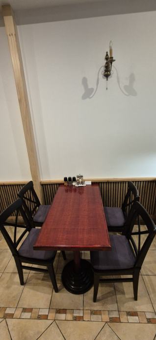 Stolovi (4× stol s 4 stolice svaki, robusni drveni).