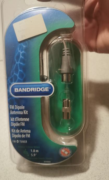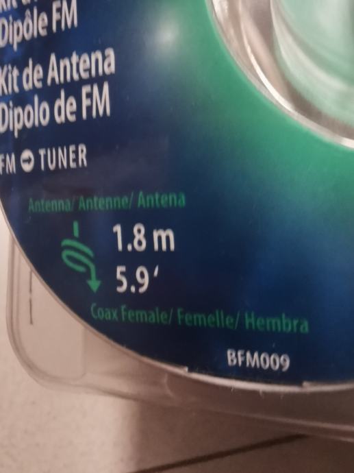Kupljen, nekorišten, originalno zapakiran. Dipol žična antena za FM 88-108MHz koja se raširi i krajeve se učvrsti čavlićima na zid ili na zadnju stranu komode u kojoj je audio linija sa FM prijemnikom na koju se spoji.