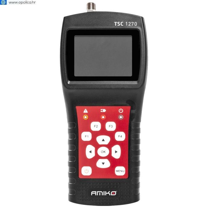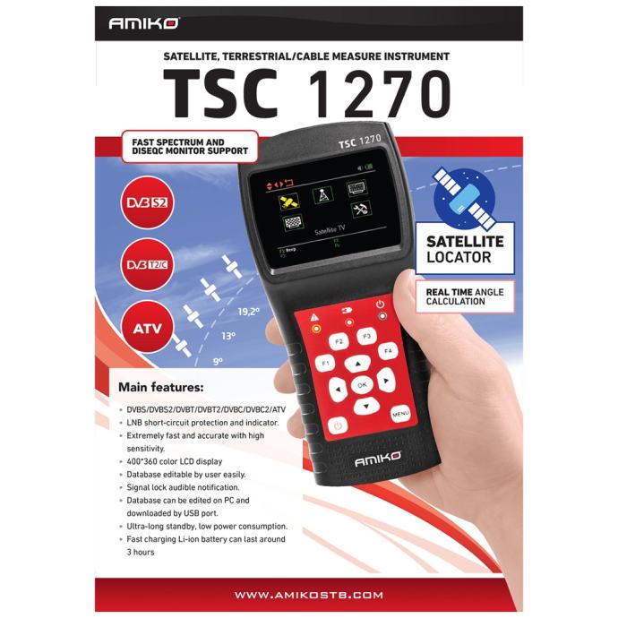 Univerzalni mjerni instrument, LCD ekran u boji, 400 x 360 pixela, podrška za VBS / DVBS2 / DVBT / DVBT2 / DVBC / DVBC2 / ATV signal, zvučna obavijest o zaključavanju signala, promjenjiva baza preko PC-a preko USB-a. Li-Ion baterija 7.4 V / 1400 mAh, za 3 sata autonomije, brzo punjenje