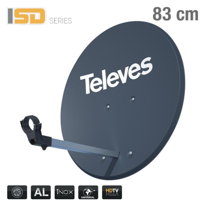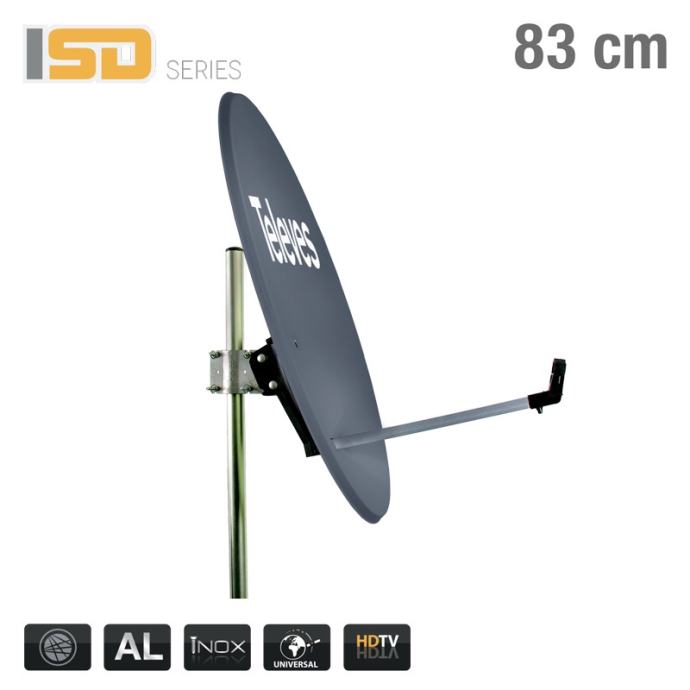 Tehničke značajke:- Boja: siva, s logotipom Televesa bijelim slovima- Promjer: 83,3 X 74,7 cm- Frekvencija GHz: 10,7 ... 12,75- Kut pomakanja: 26,6 °- Materijal: aluminijski tanjur i nosač, s vijcima od nehrđajućeg čelika i nosačem LNB-a izrađenim od specijalnog polimera ojačanog fiberglasom za ekstremnu otpornost- Debljina stijenke: 0,80 mm- Dobivate 38 dBi @ 11,7 GHz- Promjer oslonca baze: 20..60 mm- Kut nagiba (nadmorska visina): 0 ° - 90 ° stupnjeva- Vjetreno opterećenje: 130 Km / h: 499,2, 150 Km / h: 686,4