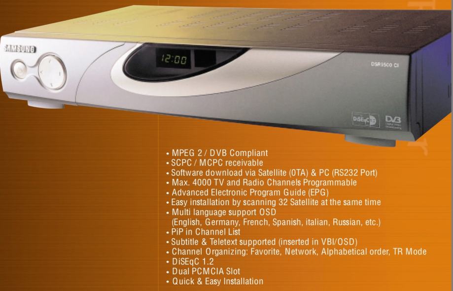 Samsung DSR 9500 VIA CI satelitski prijemnik može skenirati do 32 satelita u jednom trenutku i može pohraniti do 4.000 satelitskih i radio kanala. Kako bi se osiguralo da ste dobili najviše iz DSR 9500 VIA CI značajkama i funkcijama , morat ćete ga nadograditi s najnovijim izdanjem softvera . Nećete trebati nikakve dodatne opreme za nadogradnju softvera prijemnika .