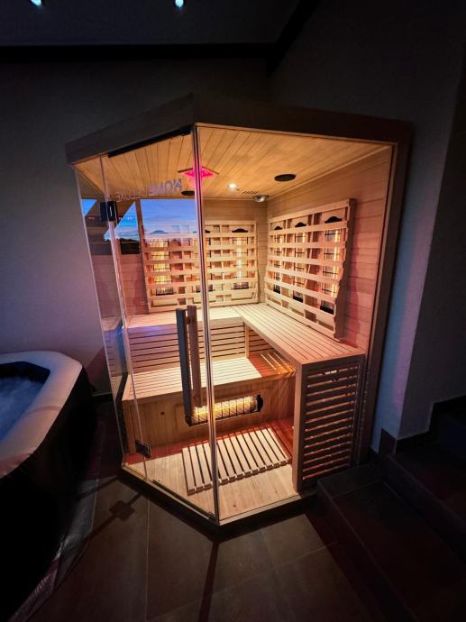 Sauna je moderna, elegantnog dizajna, s kvalitetnom drvenom izradom i staklenim vratima. Ravnomjerno zagrijavanje pomoću infracrvenih grijača omogućuje ugodno opuštanje, detoksikaciju i relaksaciju mišića uz manju potrošnju energije.