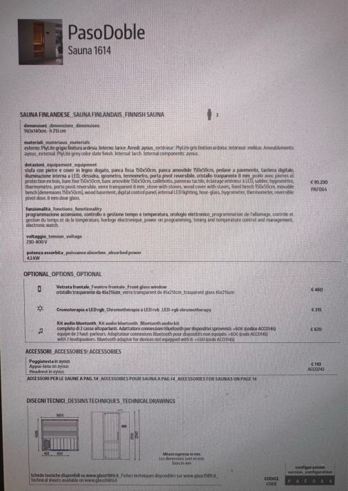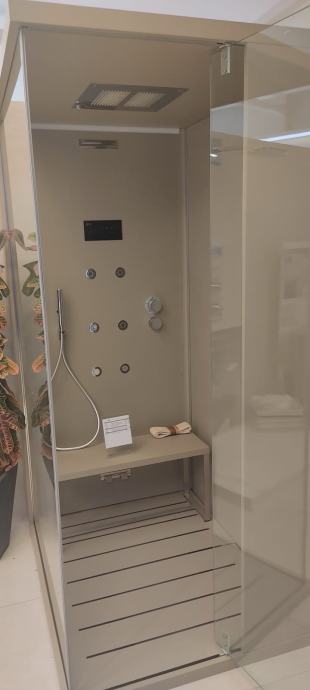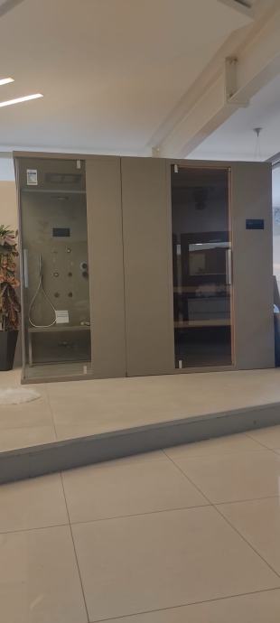 Finska sauna i Hammam sa tušem Švicarskog prestiznog proizvodjaca kupaonskog luksuznog namjestaja GLASS1989. Modularni zasebni dijelovi koji se mogu montirati zajedno ili zasebno (odvojeno jedno od drugog) u prostoriji. Potpuno novo i ne koristeno. Kupovna cijena je bila 19.572,00€.