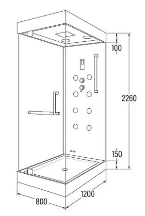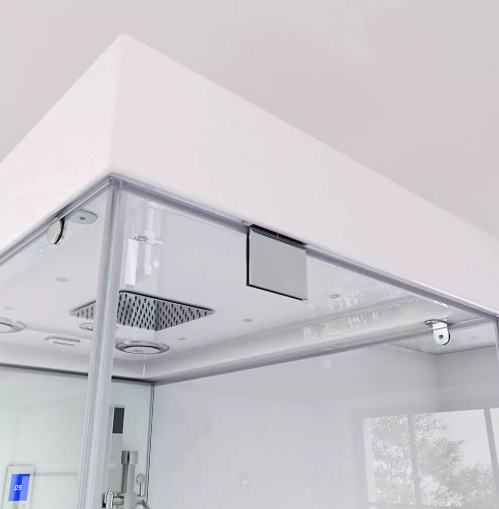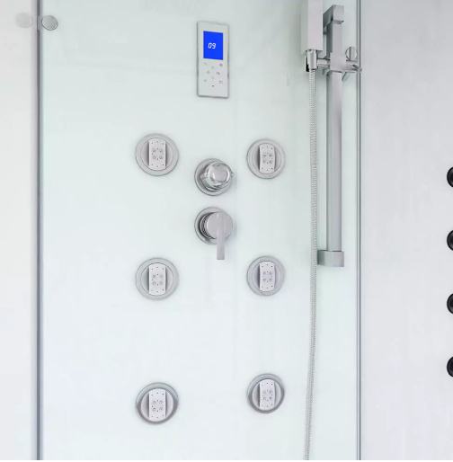 Ovaj parni tuš pravi je višenamjensko čudo. Završite svoj naporni dan vitalnom parnom saunom (do 60 ° C) i priuštite si kraljevski tuš svakog jutra. Naša Dizajn-serija ima veliku glavu za tuširanje na vrhu kabine koja omogućava da voda teče na način sličan ugodnoj tropskoj kiši. Opuštena masaža leđa (8 leđa za masažu leđa) tijekom slušanja omiljene radio stanice popularna je kod mnogih kupaca. Naravno, moguće je normalno koristiti i ručnu tuš glavu koja je podesiva pomoću fiksnog tuša. Sedam plavih LED lampica na nebeskom stropu čine „faktor dobrog osjećaja“ savršenim. Uživajte u egzotičnoj atmosferi tuširanja. Ugrađeni zaslon računala omogućuje kontinuirano podešavanje glasnoće i odabira postaje. Posebna kombinacija 6 mm prozirnog i bijelog toniranog stakla zajedno sa aluminijskim okvirom osigurava visoku razinu kvalitete. Noge tuš kabine podesive po visini koje se mogu prilagoditi gotovo bilo kojoj površini još su jedna izvanredna značajka koja ovaj tuš razlikuje od ostalih.