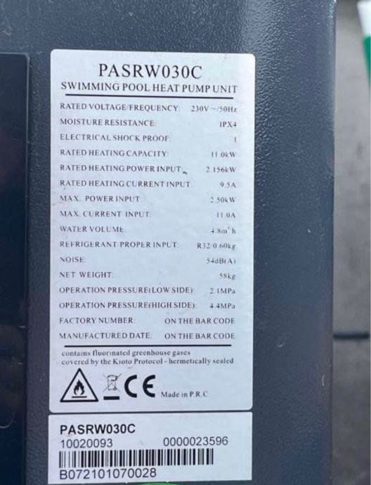 Toplinska pumpa korištena na bazenu od 60m3 sa protokom od 8m3/h.