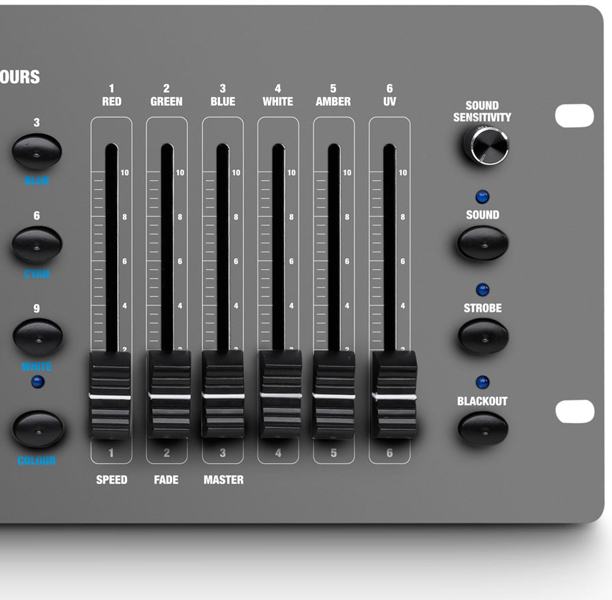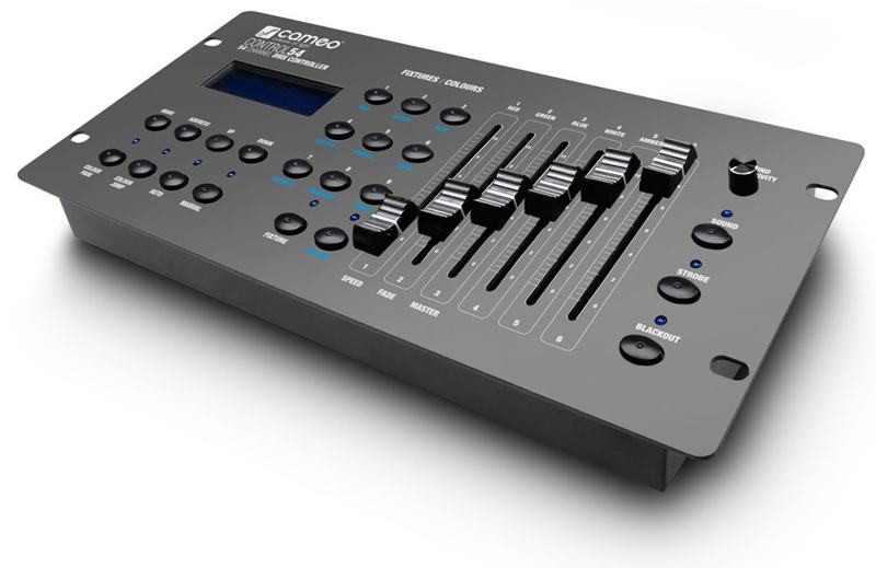 Control 54 is a compact DMX lighting desk that handles up to 9 fixtures or fixture groups. Providing easy and intuitive operation, the versatile console is an ideal choice for DJs, nightclubs, lounges and bars. It features 9 colour presets with quick-access buttons that double as fixture selectors and 6 faders to individually control Red, Green, Blue, White, Amber and UV intensity.
