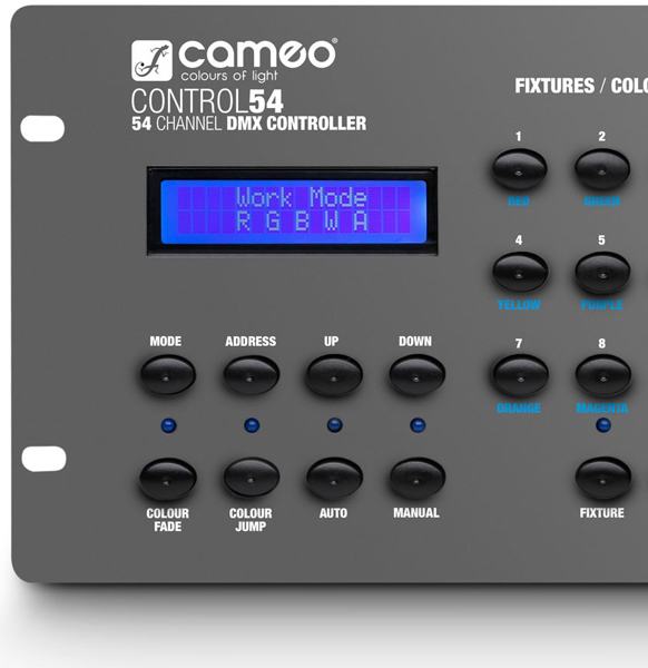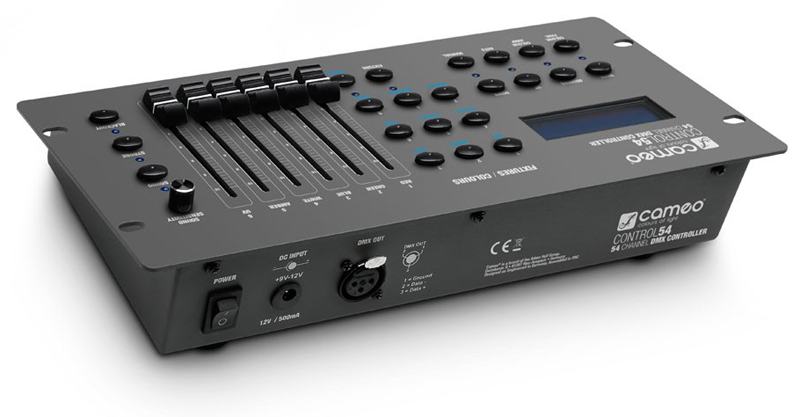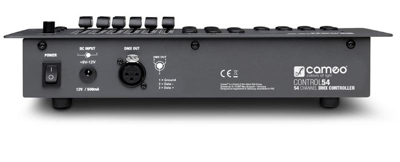 The Cameo Control 54 comes with a 9 - 12 V DC power adapter and 9 V battery for optional battery operation. It is compatible with all Cameo LED Bars, Cameo PAR Cans including the FLAT PAR PRO and FLAT PAR 1 Series and other fixtures with RGB, RGBW, RGBWA and RGBWA+UV colour mixing.