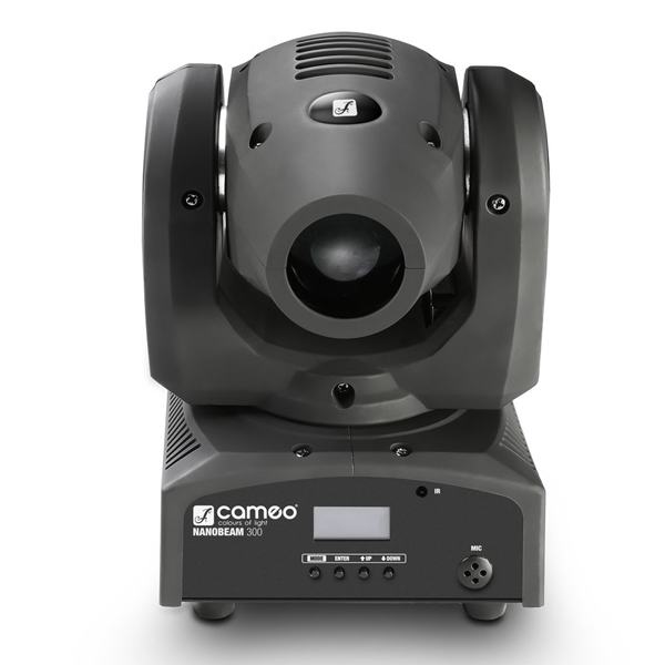 Cameo NanoBeam 300 is a miniature moving head equipped with a single 30 watt 4-in-1 Cree LED for colourful RGBW mixes. It features unlimited pan, 230° of tilt movement and a tightly focused 4° beam width. For amazing effects, a selectable inversion mode rotates the moving head in opposite directions when two NanoBeam 300 are used in tandem