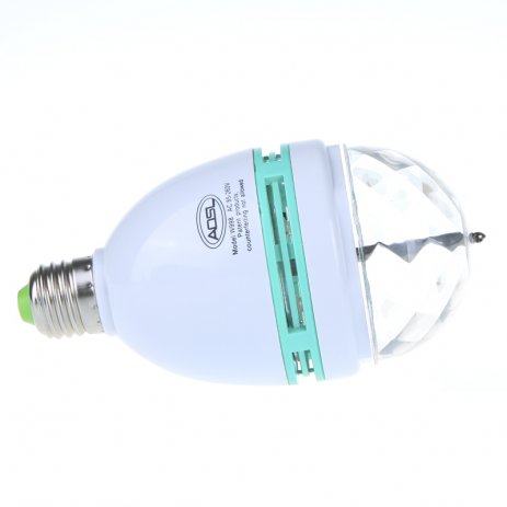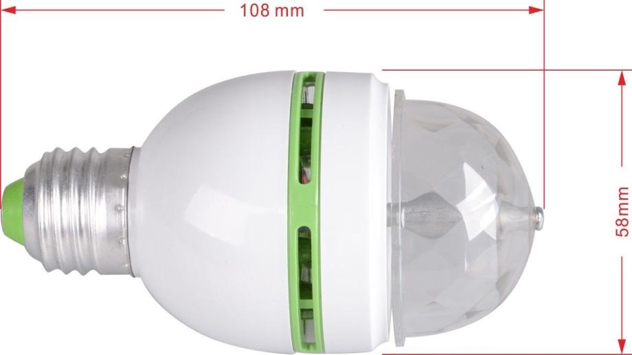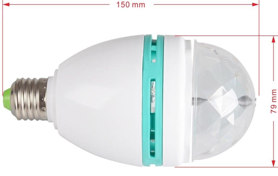 Ova LED rotirajuća žarulja ugrađuje se na mjesto klasične žarulje sa E27 grlom. Nisu potrebne nikakve preinake. Ugrađen motor automatski rotira svjetlosne točke u zelenoj, crvenoj i plavoj boji.