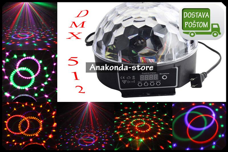 LED RGB kristalna disko kugla snage 20 W .Kugla se automatski rotira kada je upaljena. Daljinsko upravljanje bojama , vrtnjama , flash-evima. 3 načina rada : DMX , master , osjetljivost na glazbu