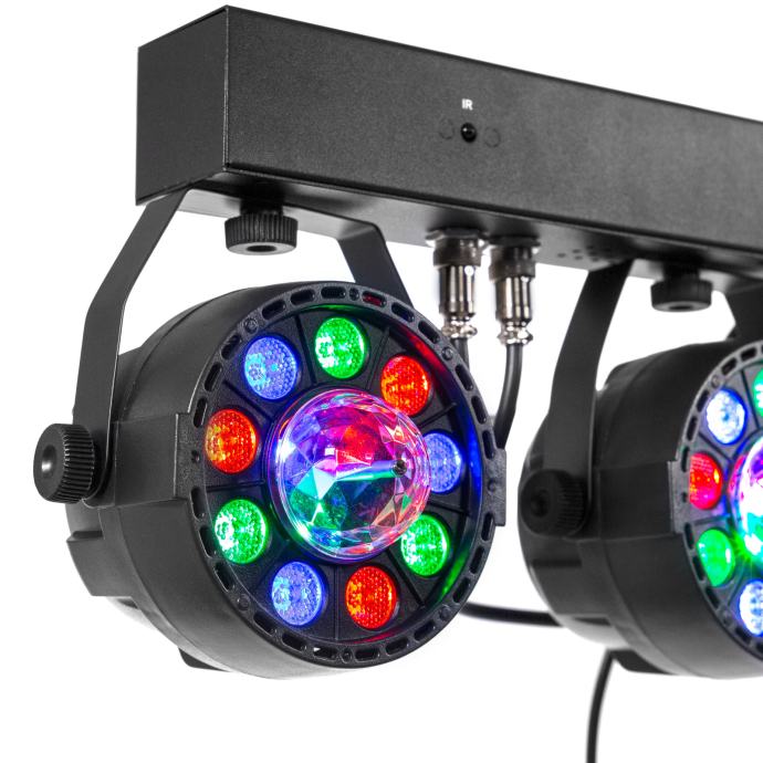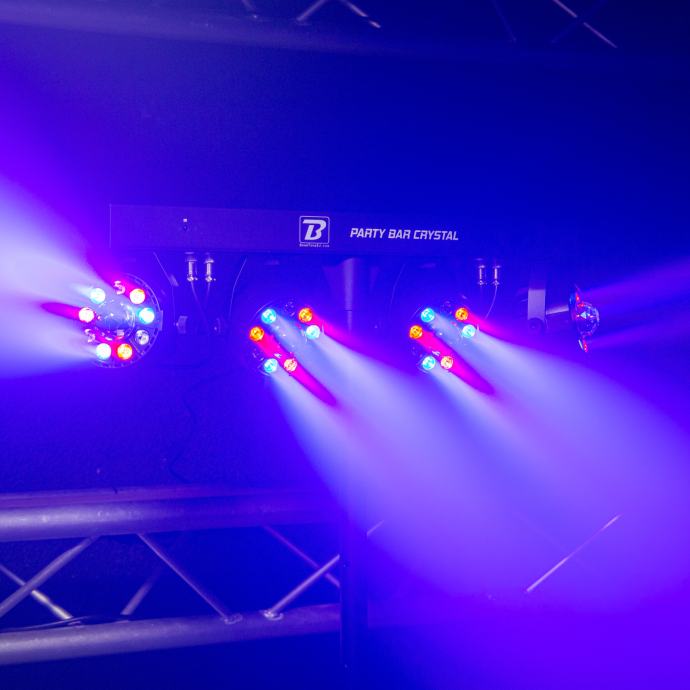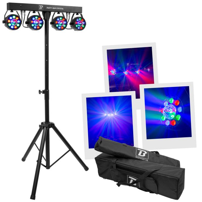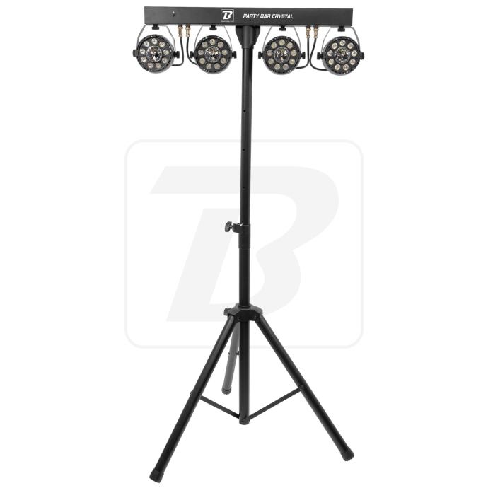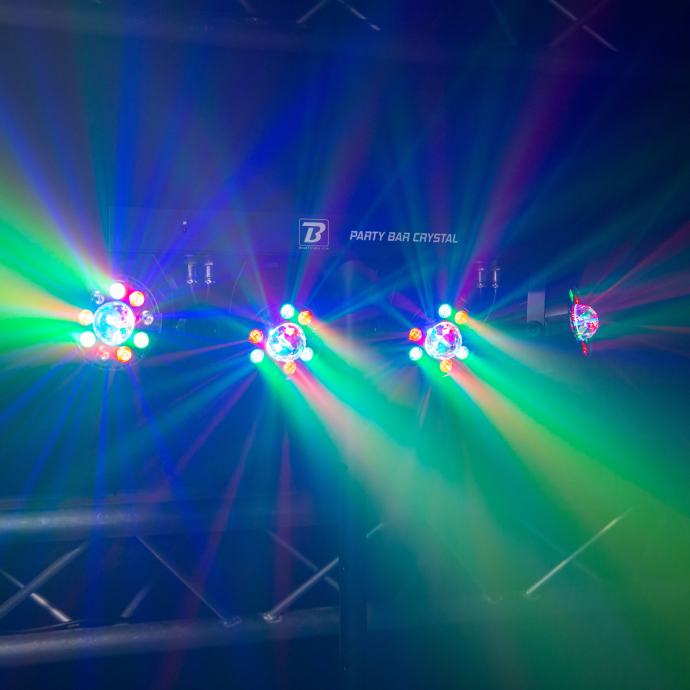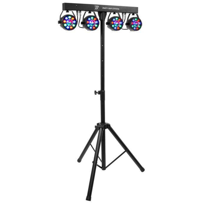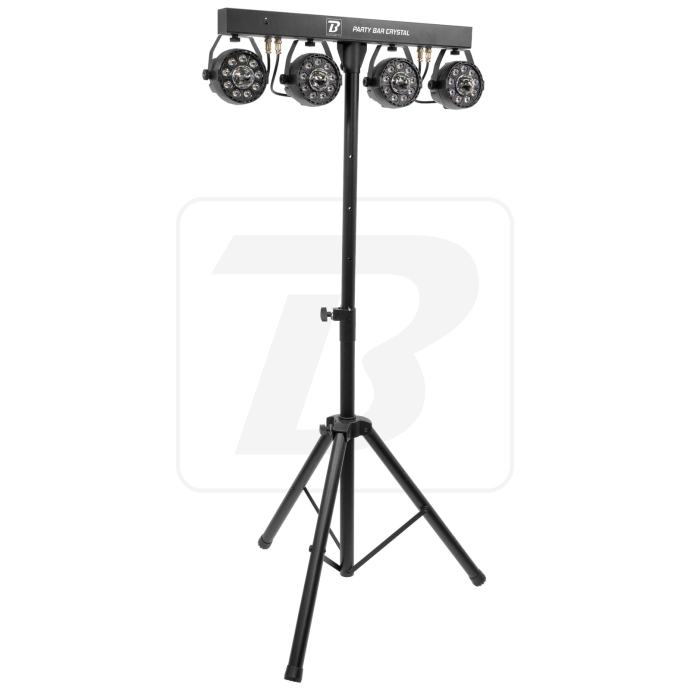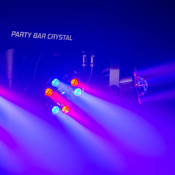 Party Bar Crystal MKII je bar s 4 9 LED RGBW projektora sa širokim poljem djelovanja i njihovim rotirajućim višesnopnim efektom u sredini, isporučuje se sa stativom i daljinskim upravljačem. Opremljen je brojnim automatskim, glazbenim i DMX kontroliranim programima, za vrhunske svjetlosne predstave. Praktičan i učinkovit, to je referenca!