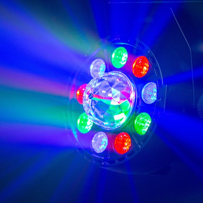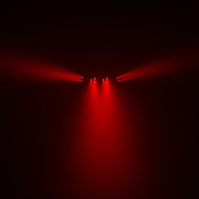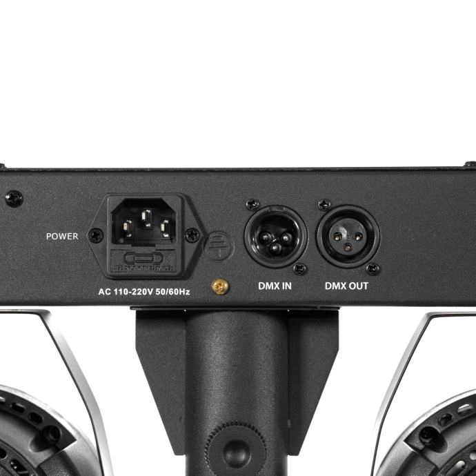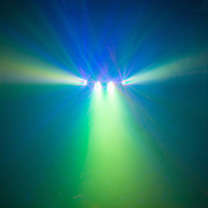 - Each Spot is made up of 9 RGBW LEDs of 1 W each and a multi-beam effect rotating in its center