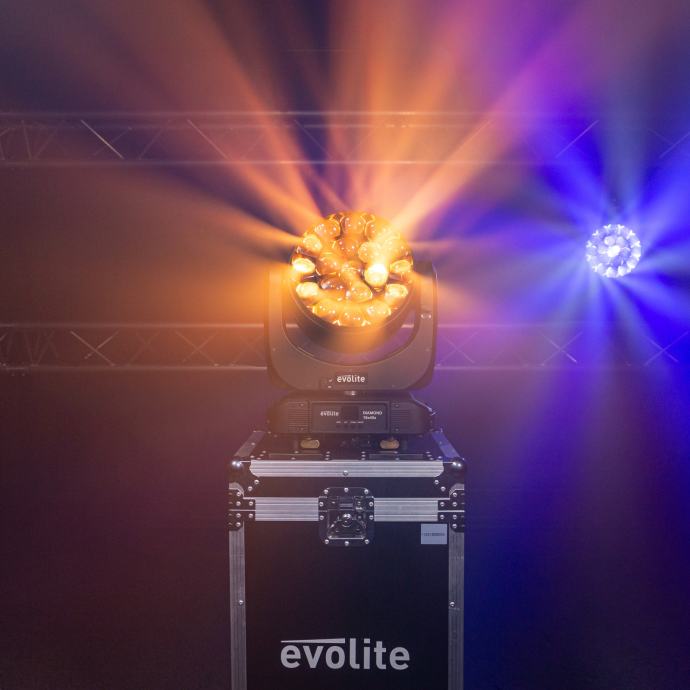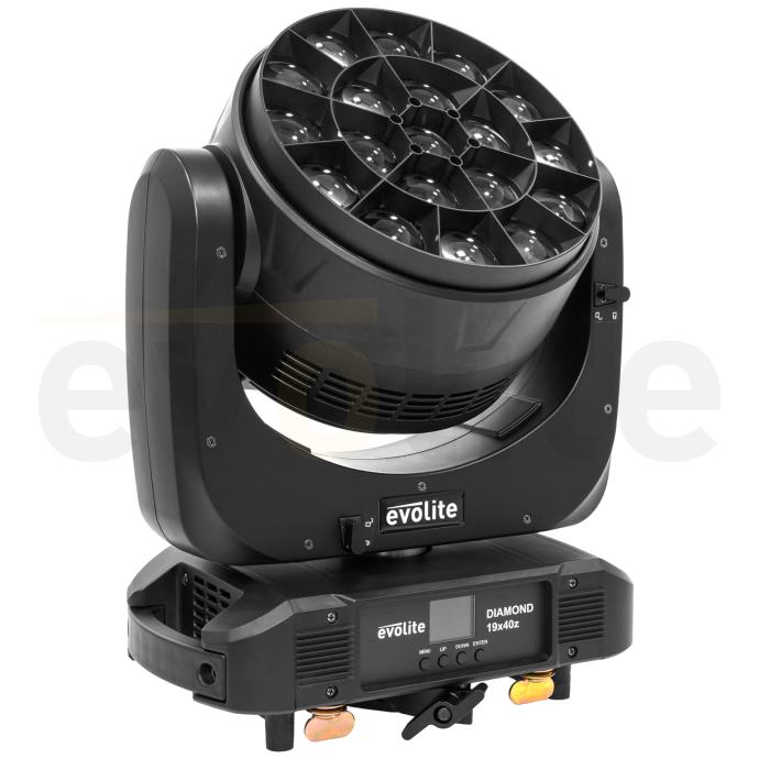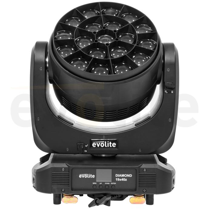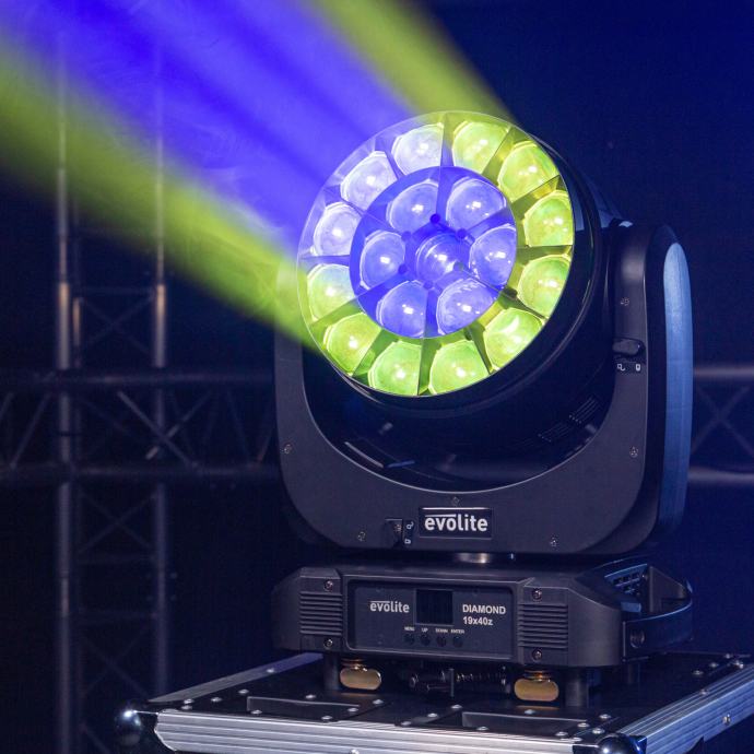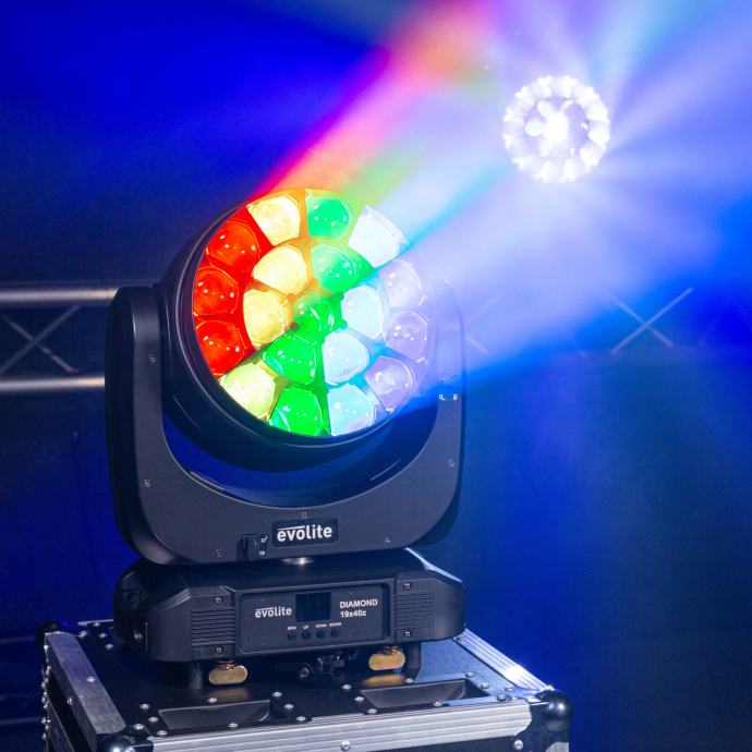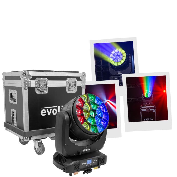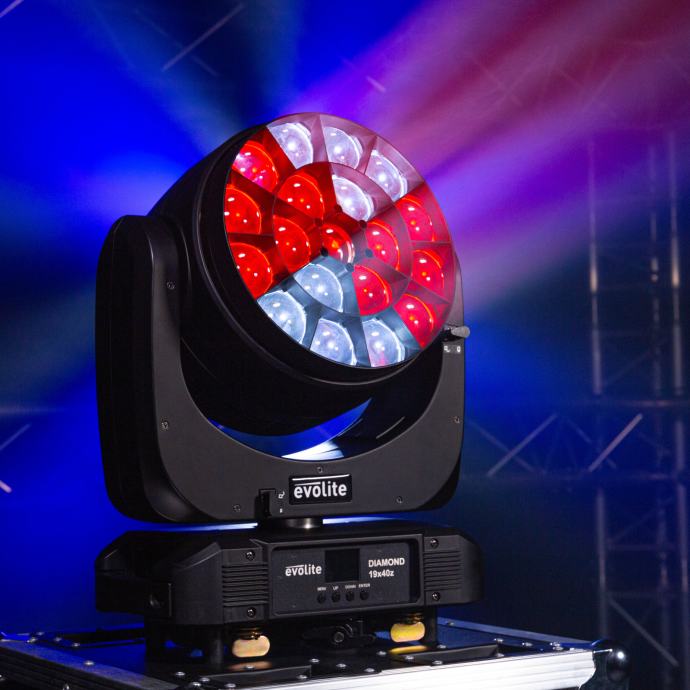 Pokretna glava Evolite Diamond 19x40z, opremljena Zoomom i multi-beam rasvjetom, koristi 19x 40 W Quad RGBW LED diode. Evolucija Evolite Diamond 19x40z iznimno je tehničko postignuće, koje se nudi po neusporedivoj cijeni. Isporučuje se u letnoj kutiji postavljenoj na kotačiće, koja zauzima jedno mjesto.