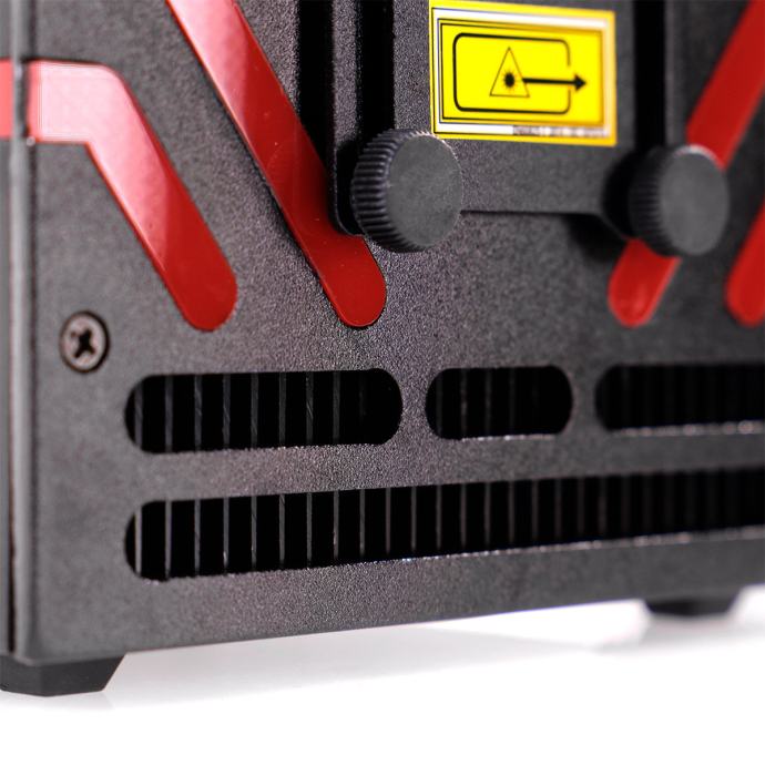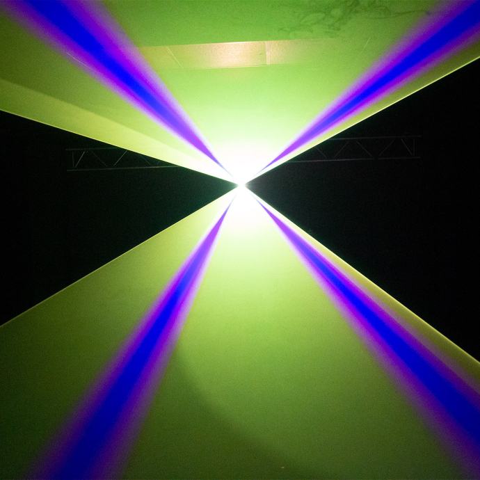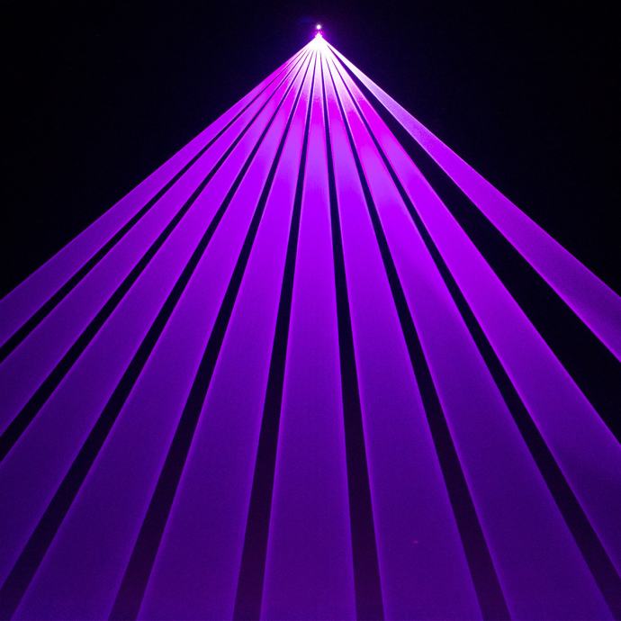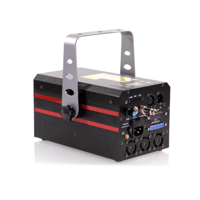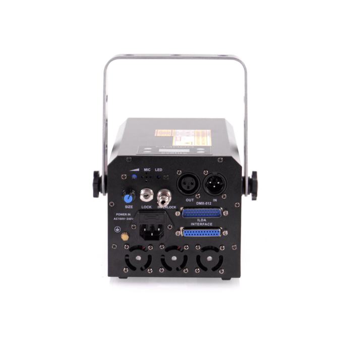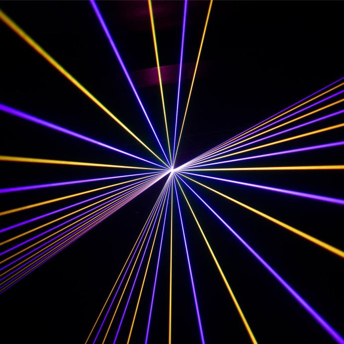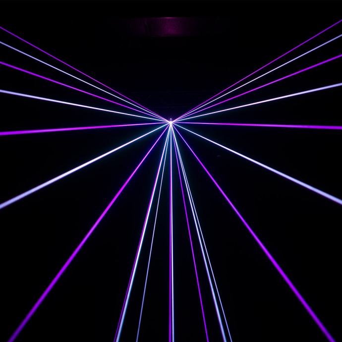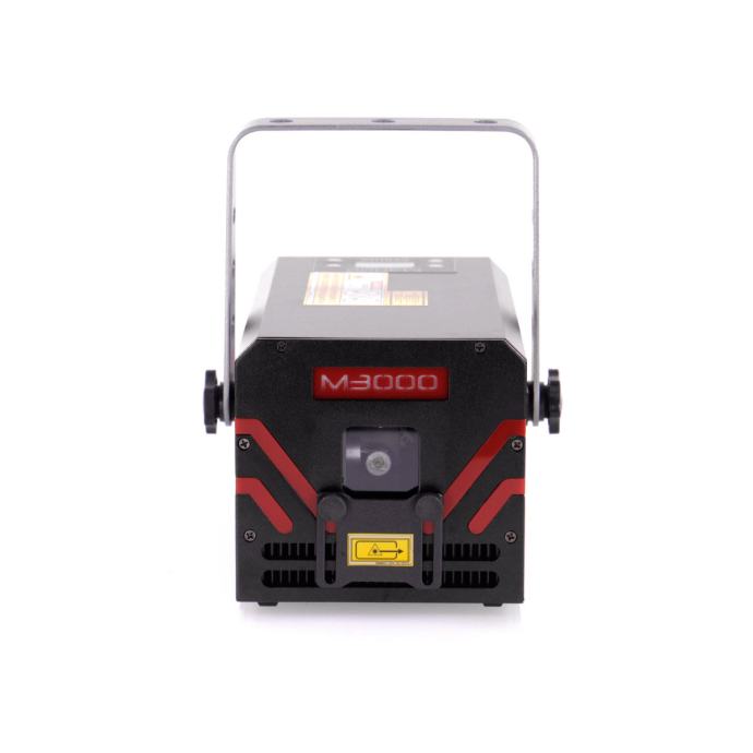 Laser s analognim diodama i galvo skeniranjem od 25 kpps@8°, RGB izvori Crvena 638nm 800mW, Zelena 520nm 800mW, Plava 450nm 1500mW, Ukupna snaga: 3000mW.