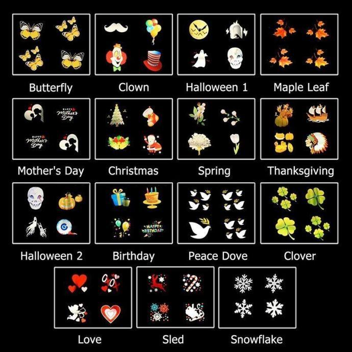 15 prebacivih slajdova: uključujući Valentinovo, proljeće, Maple Leaf, Dan zahvalnosti, Leptir, Američki nacionalni dan, Majčin dan, Mirna pećina, Rođendan, Božić, Četverokutna djetelina, Halloween, Klaun, Pahuljice, sanjkanje itd. tijekom cijele godine.