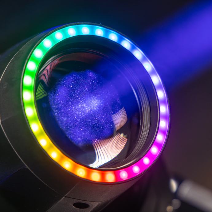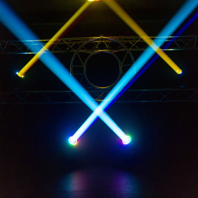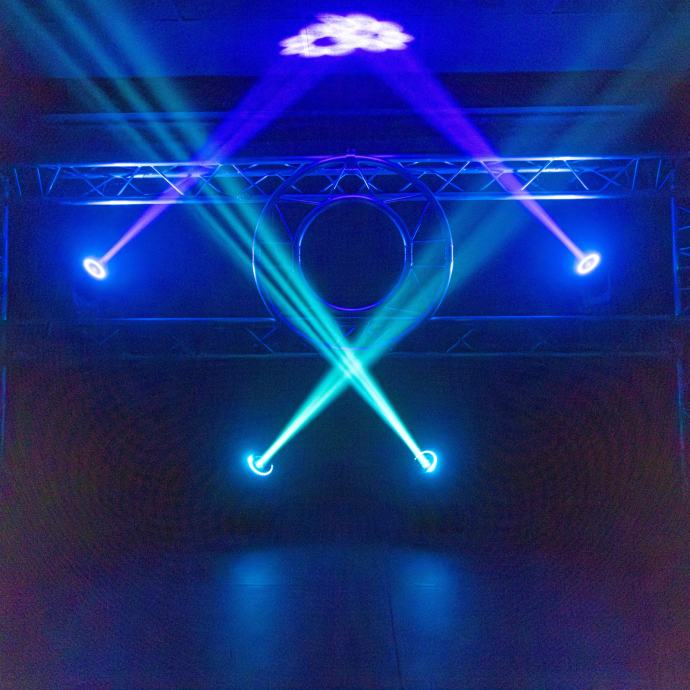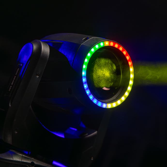 Mac Beam 150 moving head iz Mac Mah: 150 W bijela LED dioda, rotirajuća pryzma, gobo i kotačići u boji, napredna DMX kontrola za dojmljive unutarnje efekte.