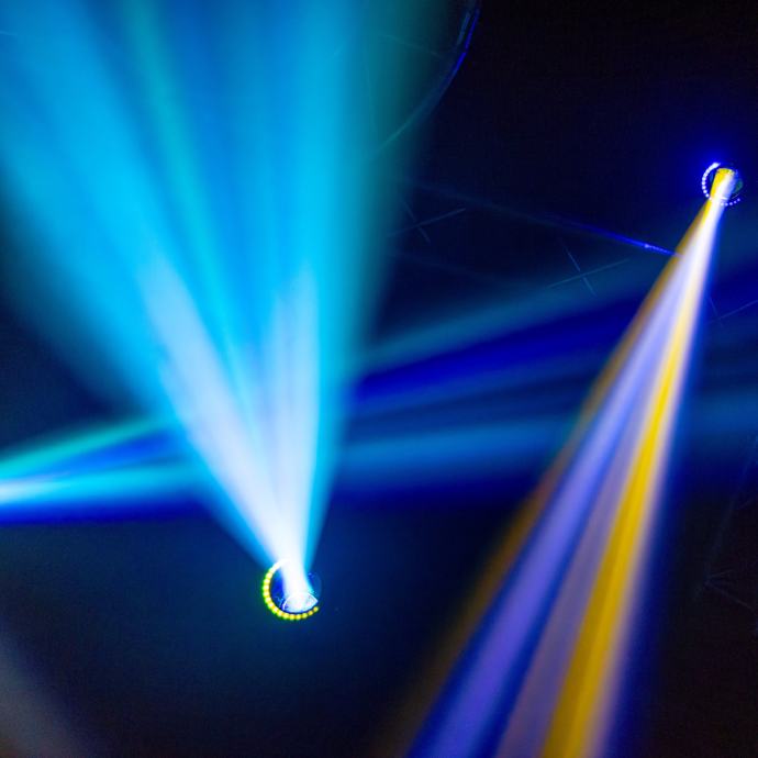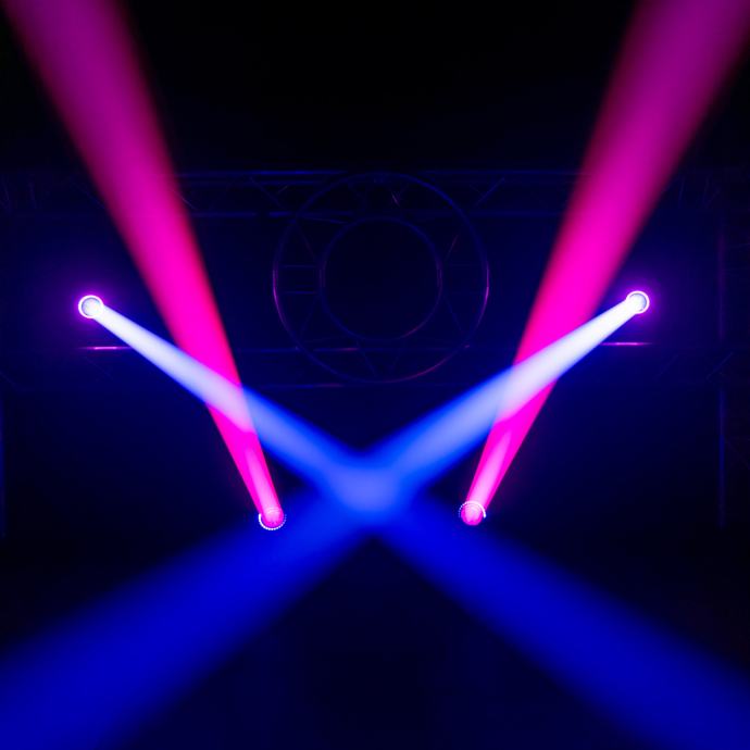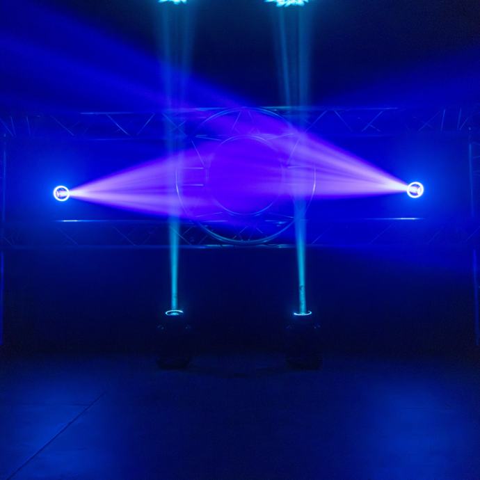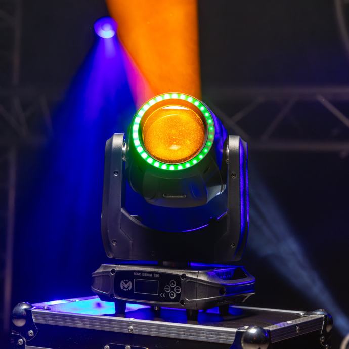 Set od 2 Mac Beam 150 LED svjetla s torbicom za letenje. Snažan svjetlosni tok, različiti efekti i DMX kontrola za profesionalne primjene.