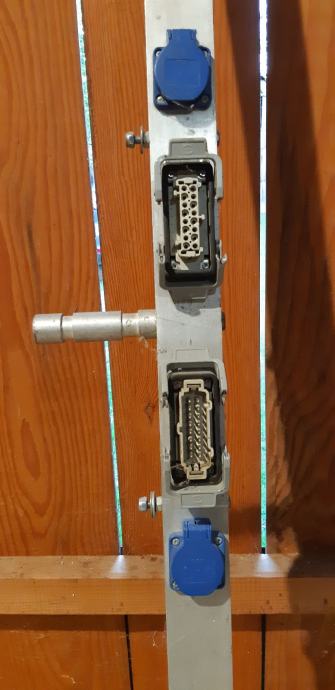 Aluminijski T bar za reflektore, 2 m dužine, 8 šuko utičnica, ulazna i izlazna Harting 16 utičnice, 28 mm Tv spigot.