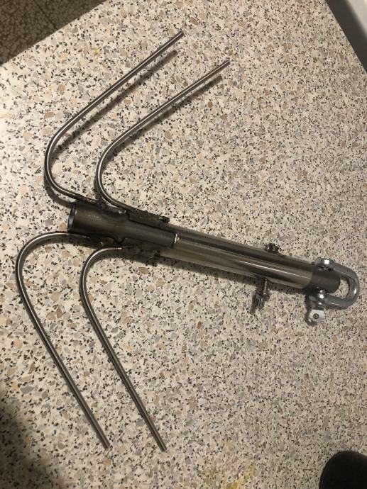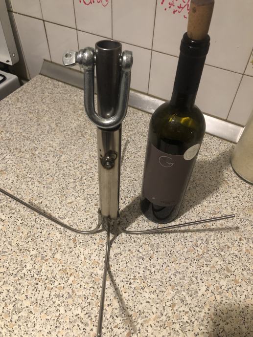Sidro s leptir vijkom i škopcem, debljina žica 5 mm, dimenzija preko krakova cca 36 cm, visina (bez škopca) 32 cm, svi dijelovi inox osim škopca, ne baš sretno zavareno (elektrolučno, elektrodom za inox) i možda čudne konstrukcije, ali sigurno funkcionalno. Masa (sa škopcem) 0,9 kg. U središnju cijev se može dodati masa. Može se poslati putem Tiska (najveći paket radi dimenzija+ambalaža=5€). Boca na slici je samo radi usporedbe.