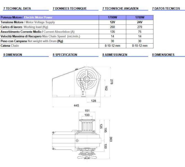 Fyn (0530) horizontal windlass with aluminium gearbox white painted and chromed bronze drum. Chromed bronze barbotin for 8mm � 10mm ISO ï½ 12mm ISO chains. Suitable for boats up to 17mt.