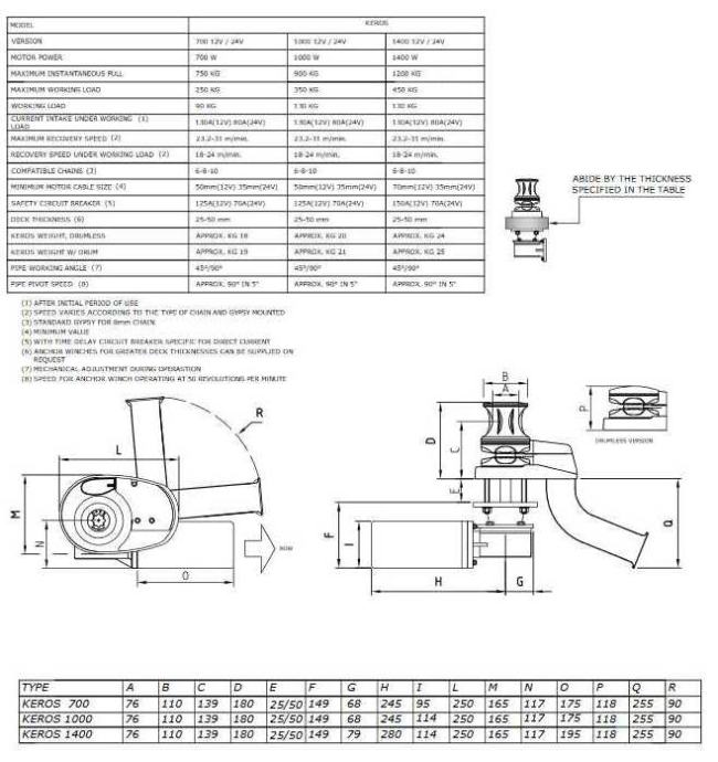 Anodyzed aluminium alloy windlass. Available in high or low profile, with different drives and recommended for boats up to 16 m. KEROS has a unique chain distribution system (ECS) integrated into its mechanism. This innovative system prevents stacking of the chain in the forepeak, and is completely mechanical and has a very small footprint. The windlass can use the 6 mm, 8 mm or 10 mm chains and is equipped with rope tensioner. Comes with built-in chain counter sensor.