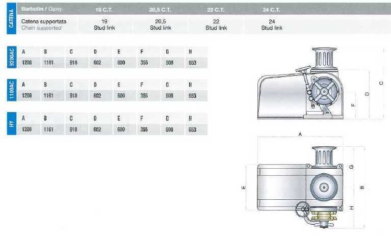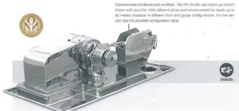 Stainless steel horizontal axis windlass. The NH-24 can use chains up to from 24 mm with stud link. With different drives and recommended for boats up to 80 meters. Avaliable in different drum and gypsy configurations. For the version see the windlass configuratio table.