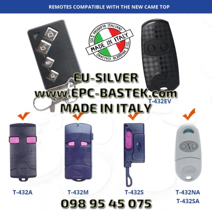 Kompatibilnost:: ADYX, AETERNA, ALLMATIC, ALLISTER, ALLSTAR, ALLTRONIC, ANSONIC, APERTO, APRIMATIC , AUTELCO, AVIDSEN, BANDY, BELFOX, BENINCA, BESIDE, ETA, ELETTRONICA, BFT, CAME, CARDIN , CARPER, CASALI GENIUS, CASIT, CELINSA, CENTURION, CHAMBERLAIN LIFTMASTER MOTORLIFT SEARS CRAFTSMAN, CPS, DASPI, DEA, DELMA, DICKERT, DIGICODE,DITEC, DOITRAND FDOITRAND, DOORMATIC, DUCATI, ELBE, ELCA, ELEK, ELVOX, EMFA, ERONE, FAAC, FADINI, FERPORT, GIBIDI, GOBBATO, GTO, GULLIVER, HAUSS, HEDDOF, HORMANN, JAY ,JCM ,KING, LABEL, LEB, LINCE ,LINEAR, MA SYSTEM, MARANTEC,MONSEIGNEUR, MOTORLINE STATEUROP, MOTOSTAR, NICE, NOLOGO, NOVOTECNICA, OPENOUT, PORTAMATIC, PRASTEL, PROEM, PROGET, PROTECO, PUJOL, PULSAR, QUASAR, RADIODIGIT ,ROGER, SEA, SEAV, SENDER, SERAI, SICE, SIMINOR, SKYLINK, SMD, SOMFY, STAGNOLI, STANLEY ,STARTEC,STINGER,TAU,TEC KEY,TECNOMATIC,TEDSEN BERNER,TELCOMA,TELEMATIC ,TKC, TONKARR , TORAG, TORMATIC DORMA, TREMA, UBAUTO, V2, VISONIC, WAINE, DALTON, WECLA, ZULLAN, OEM I DR