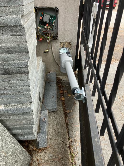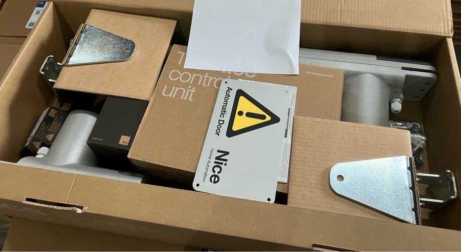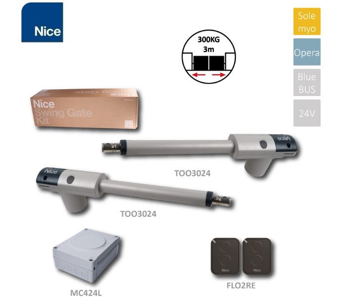 Prodajem NOVI zapakirani set TOO3024KCER10 za automatizaciju krilnih vrata tvrtke Nice. Koristi se za automatizaciju krilnih vrata s duljinom krila do 3 m i masom vrata do 300 kg. Motor je teleskopski, velike brzine, idealan za industrijsku i stambenu upotrebu. Radni ciklus je intenzivan, a trajanje ciklusa otvaranja/zatvaranja je 0,14 m/s. Motor ima visok stupanj zaštite od prašine i nepovoljnih vremenskih uvjeta zahvaljujući IP54 standardu. Komplet sadrži:
