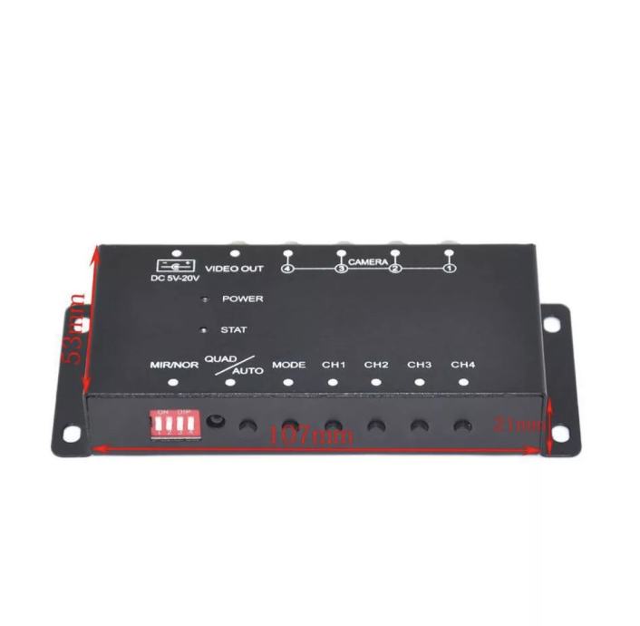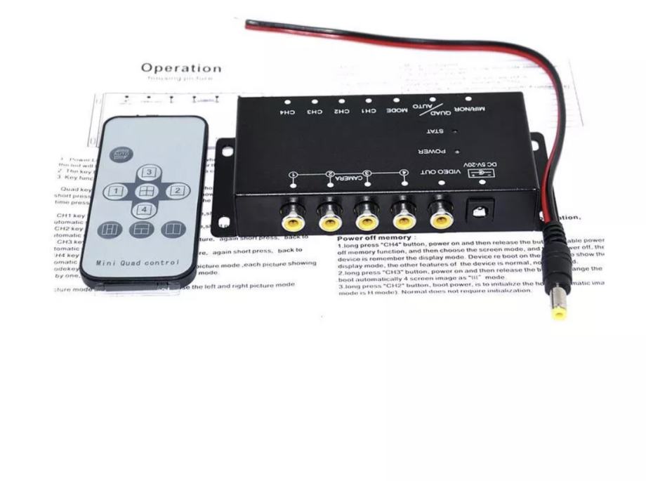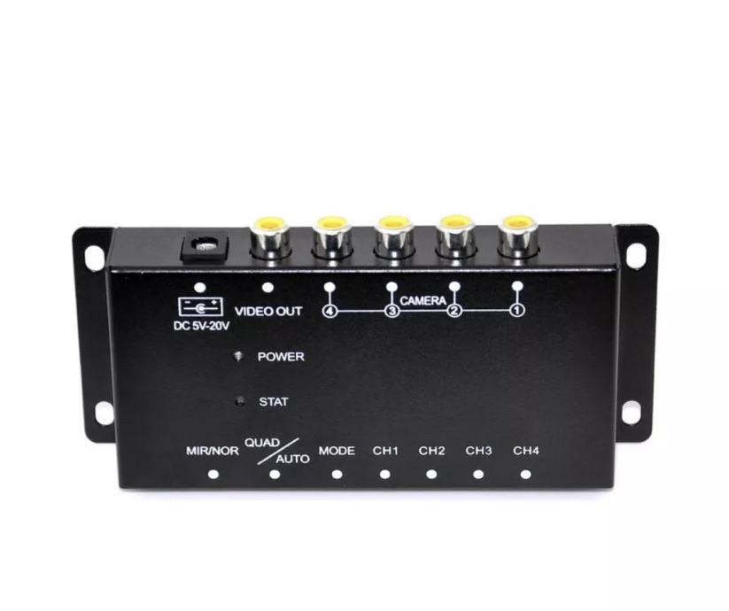 Uređaj za priključivanje 4 kamere na vozilu . Spajanje na dosadasnji ekran koji imate , samo sta sad imate 4 kamere i 4 slike na istom ekranu ,