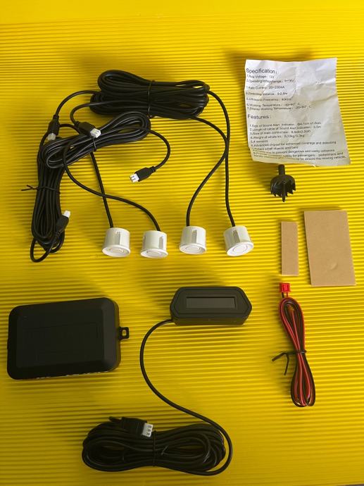 - U paketu se dobija: 4 senzora (duzina kabla 2.5m), zvucni indikator, naponski kabl, burgija za branik, korisnicka upustva, kontrolna kutija