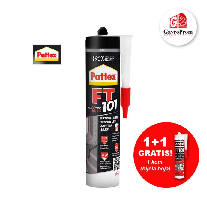 - PATTEX FT101 je visokokvalitetna fleksibilna masa koja je idealna za lijepljenje, brtvljenje i ispunjavanje različitih građevinskih materijala. Njegova izvanredna prianjanja omogućuju korištenje bez potrebe za nanošenjem premaza, dok se istovremeno može primijeniti i na vlažne površine bez negativnih efekata poput mjehurića ili gubitka svojstava.Ova višenamjenska masa je savršena za brtvljenje spojeva, lijepljenje materijala i ispunjavanje pukotina ili rupa. Ne samo da će pružiti pouzdane rezultate, već će olakšati i ubrzati građevinske projekte. Brtvena masa FT101 također je prikladna za dilatacijske spojeve.