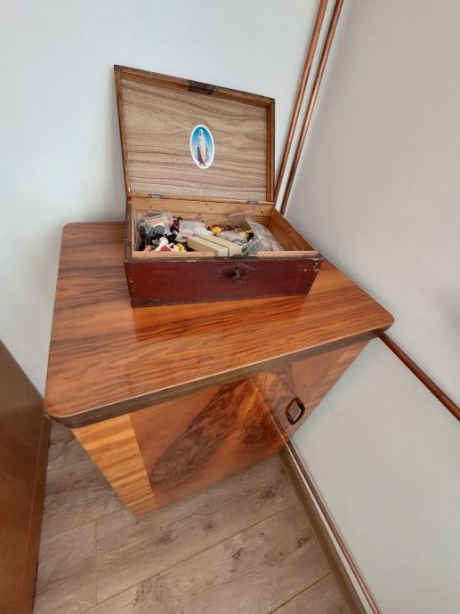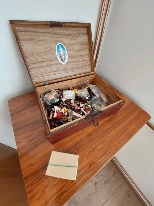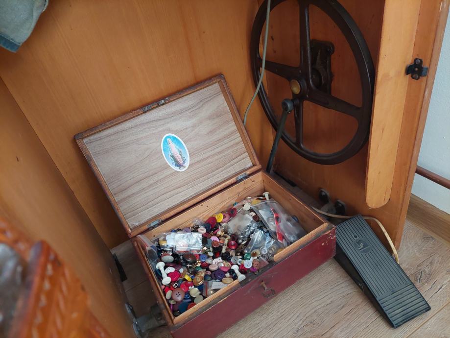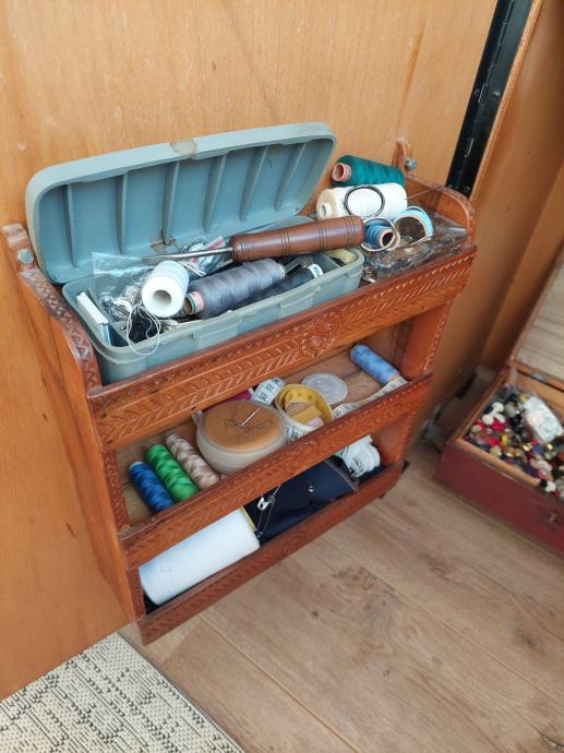 Ima puno dodatnog pribora,konce,gumbe itd tako da se može koristiti ili moze poslužiti kao retro ukras.
