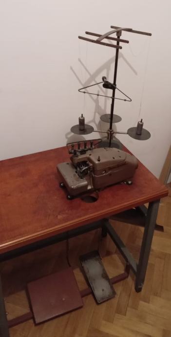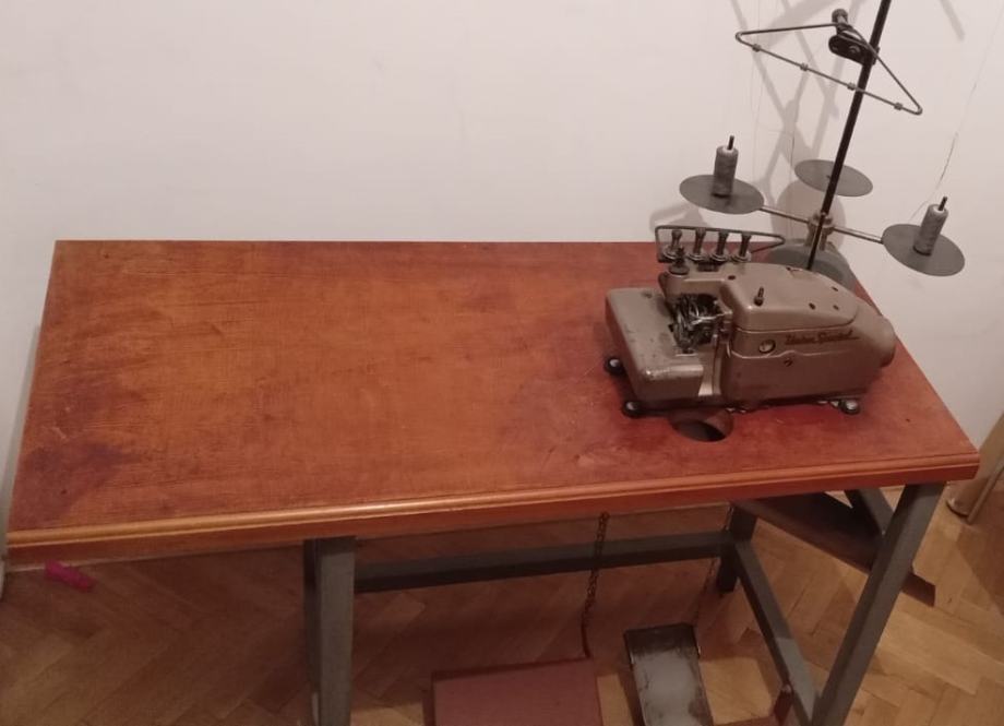 Industrijska šivača mašina - endlerica UNION SPECIAL 39500 sa čeličnim postoljem (stolom), original kanalicom za prikupljanje otkinutog restla i stalkom za konce.