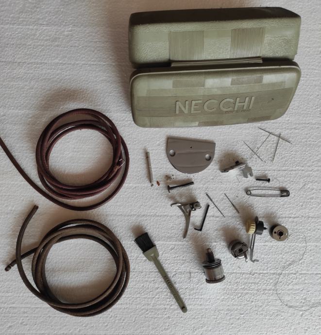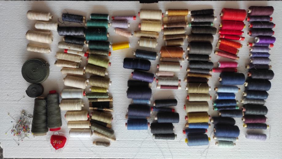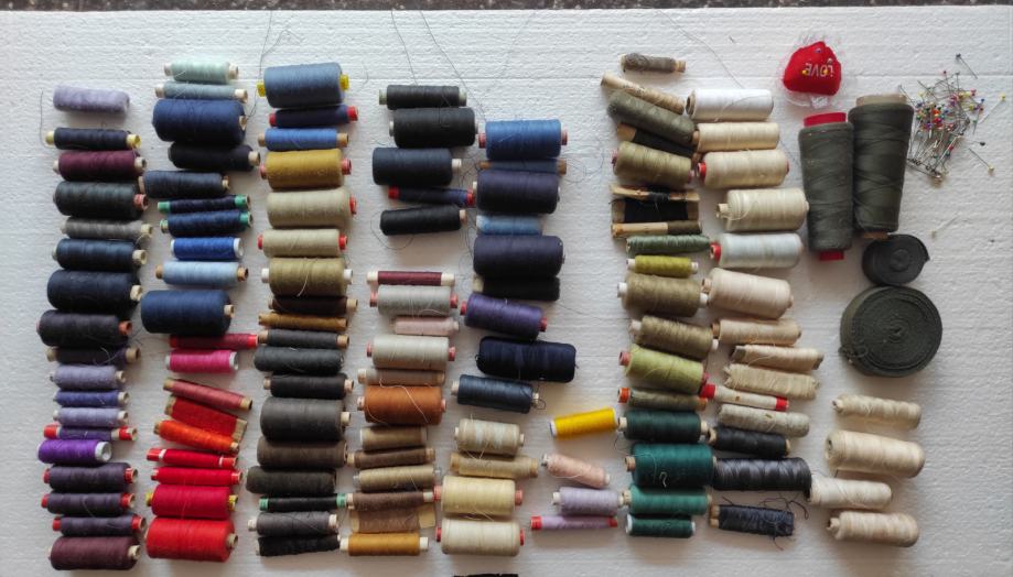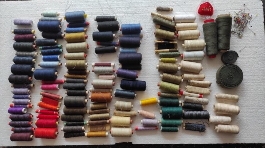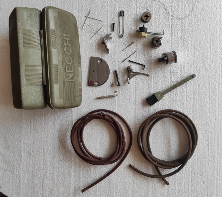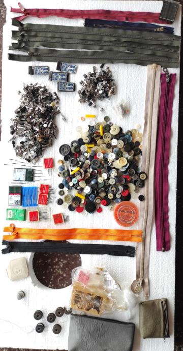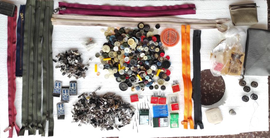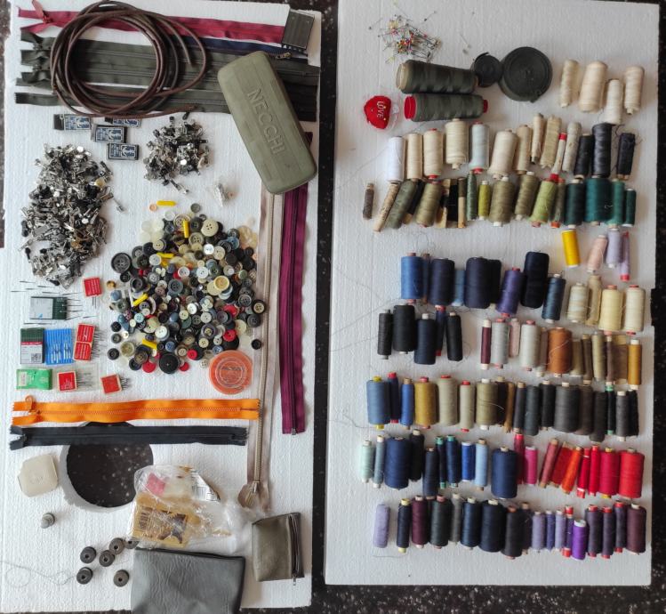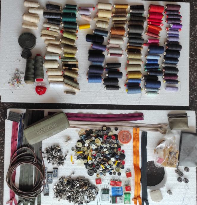 Razni pribor za šivanje, 135 komada raznobojnog konca, gumbi, mašinsko ulje, igle za mašinu i za ručno šivanje, špenadle, zatvarači 9 komada, 2 kožna okrugla remena za nožni pogon dužine 175 cm, kutija za pribor, kreda, špule, metalni napršnjak (naprstnjak), iskazana cijena je za prodaju u setu