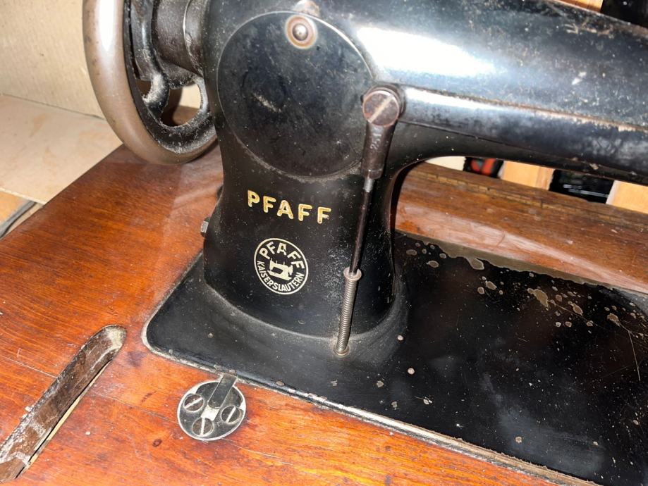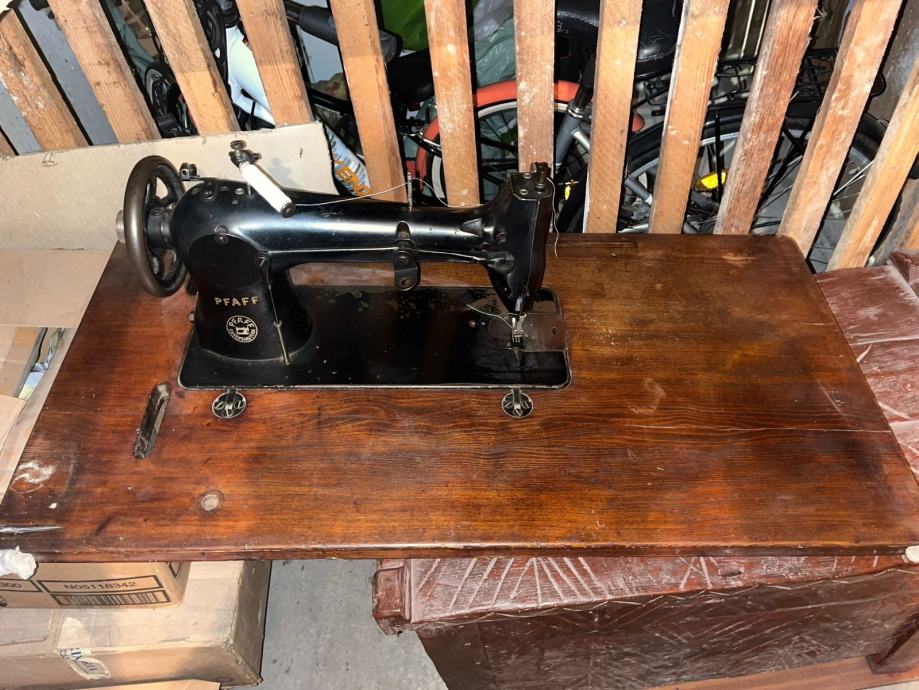 Šivaća mašina Pfaff u ispravnom stanju s drvenim postoljem koje je u izvrsnom stanju zajedno s ladicom.