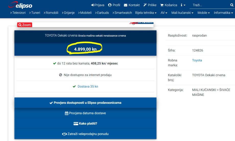 Cijena šivaće mašine u trgovini je 4.899 kn, što se vidi iz priložene slike s Web Shopa, a imam i račun.
