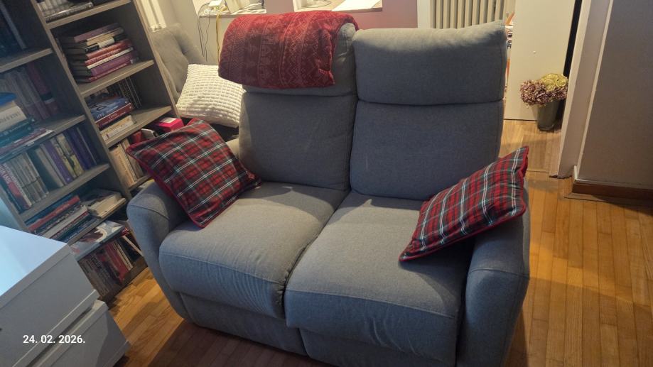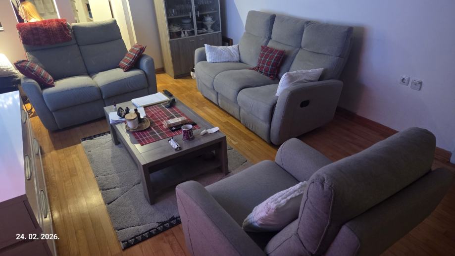 Garnitura trosjed, dvosjed i fotelja, sve sa relax opcijom. Siva boja. Staro 7 godina, u dobrom stanju. Prijevoz osigurava kupac.
