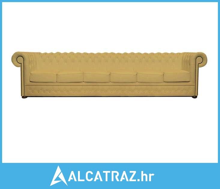 ***POSJETITE NAŠ SHOWROOM I UVJERITE SE U ENGLESKU KVALITETU*** Chesterfield First Class leather 6-sjedišta sofa Ivory Ruka majstora na ovom Chesterfield kauču od goveđe kože prvog razreda jasno je prepoznatljiva po lijepo završenim detaljima, poput zakovica i tapeciranih rukohvata i naslona.Jedan od najvažnijih materijala prilikom proizvodnje dobrog Chesterfield kauča je koža. Chesterfield namještaj izrađuje se ručno od visokokvalitetne polu-anilinske kože, koja se zatim lakira.Okvir je izrađen od bukovog drveta, koje je zalijepljeno i vijčano. Duga tradicija zanatstva vidljiva je kroz udobnost i izgled klase.Chesterfield model 'First Class' je model koji svi poznajemo kao pravi Chesterfield. Ovaj Chesterfield model dostupan je samo u goveđoj koži i dostupan je kao Klasa i Prva klasa.Uz svaki komad namještaja standardno se isporučuje certifikat autentičnosti i jamstvo vrhunske kvalitete. Tehnički podaci