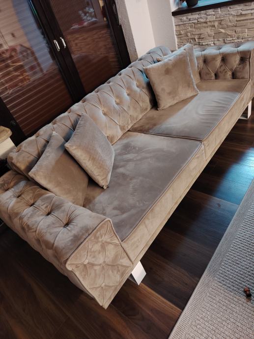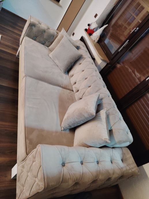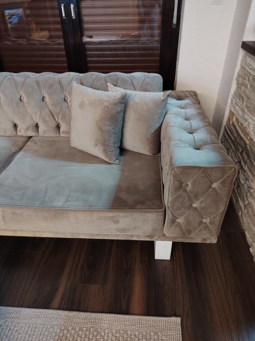 kupljeno u Aledo namještaju prije 4 godine. Očuvano. Inače pokriveno stalno na djelu za sjedenje. Materijal je super za održavat. Briše se mokrom krpom bez problema. Skupo plaćeno Slike u privitku