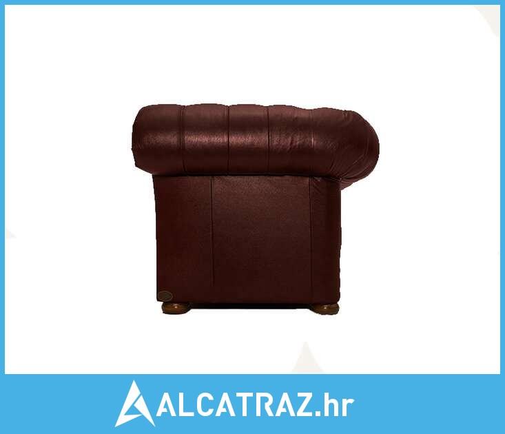 Ruka majstora u ovim komadima namještaja od goveđe kože jasno je prepoznatljiva po lijepo izrađenim detaljima, poput zakovica, rukohvata i naslona.Jedan od najvažnijih materijala prilikom proizvodnje kvalitetnog Chesterfielda je koža. Chesterfield namještaj ručno je izrađen od visokokvalitetne poluanilinske kože, koja se zatim lakira.Okvir je izrađen od bukovine, koja je zalijepljena i vijčana. Duga tradicija zanatskog umijeća vidljiva je kroz udobnost i izgled First Class modela.Chesterfield model 'First Class' jedan je od vrhunskih modela Chesterfielda. Ovaj Chesterfield model od kože također je dostupan i u tkanini i vintage koži.Uz svaki komad namještaja standardno se pruža certifikat autentičnosti i jamstvo kvalitete.Tehnički podaci