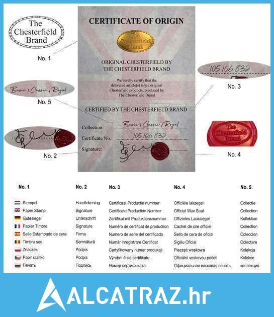 Vrijeme proizvodnje: 6-10 tjedana POSJETITE NAŠ SHOWROOM I UVJERITE SE U ENGLESKU KVALITETU Veliki izbor uzaraka prave kože i drva. Svaki komad posjeduje originalni certifikat za Chesterfield namještaj koji jamči da je Vaš komad proizveden prema najvišim standardima, koristeći samo najkvalitetnije materijale i tradicionalne tehnike izrade. Ovaj certifikat potvrđuje autentičnost Chesterfield brenda te jamči da ste dobili pravi Chesterfield komad, a ne repliku ili kopiju. ---------------------------------------------------------------------