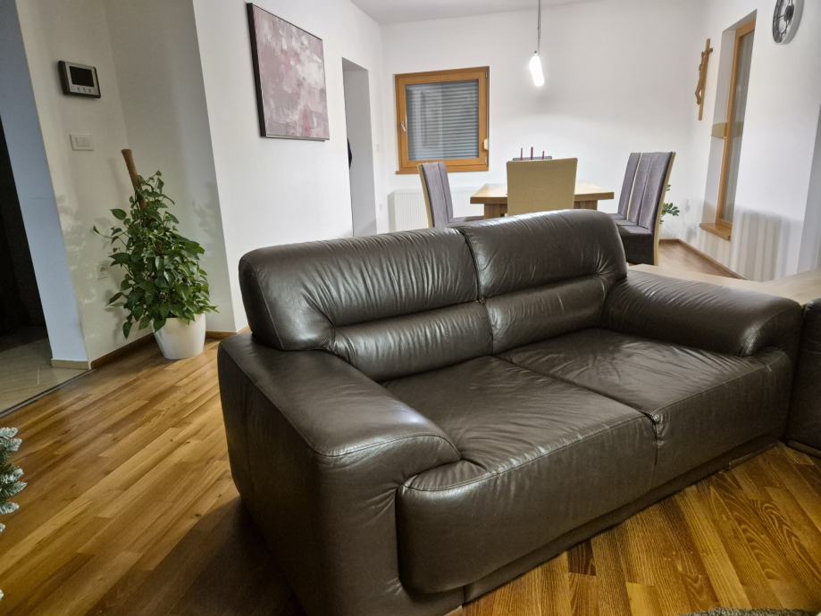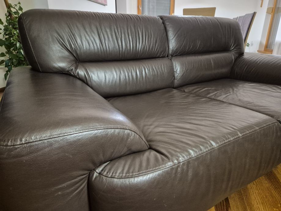 Prodajrm dvosjed i trosjed +kutni stolić. Sjedeća garnitura je tamno smeđe boje (koža). Stolić je dodatak za kut između garnitura ili može biti zaseban.