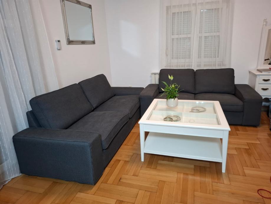 Prodajem, trosjed, dvosjed u sivoj antracit boji i stol u bijeloj boji (drvo staklo) u jako dobrom stanju.